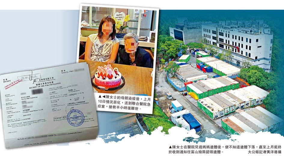 陳女士趕到醫院時,媽媽的遺體已在包屍袋內,放在一間編號「22號」的房間內,房內還有其他多個包屍袋。由於在急症室離世,遺體按非自然死亡處理程序,被送到公共殮房。陳女士當日見過媽媽的遺體後,便不知道遺體下落,多次向醫院與富山殮房打聽都沒有消息。直至3月30日,她終於收到警方通知往認領遺體。