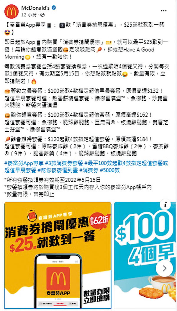 麥當勞都有消費券優惠。麥當勞即日起於「麥當勞App」推出三款全新消費券套餐優惠券,讓App用戶專享低至100元就買到四個超值套餐或超值早晨套餐,成功選購有關優惠後,指定套餐換領券更會於三個工作天內自動存入麥當勞App內新增設的「消費券專區」,所有套餐換領券有效期至今年5月15日。