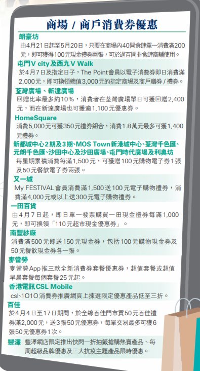 為搶佔消費券商機,各大商場紛紛推出優惠。華懋集團更推出300%回贈優惠,旗下7大商場包括如心廣場、翩滙坊、好運中心、希爾頓中心、粉嶺名都商場、上水名都商場及巴黎倫敦紐約戲院購物中心,以及由集團負責管理及營運的中環街市,只要消費滿100元,即可獲贈一套三張100元現金券,合共價值300元。