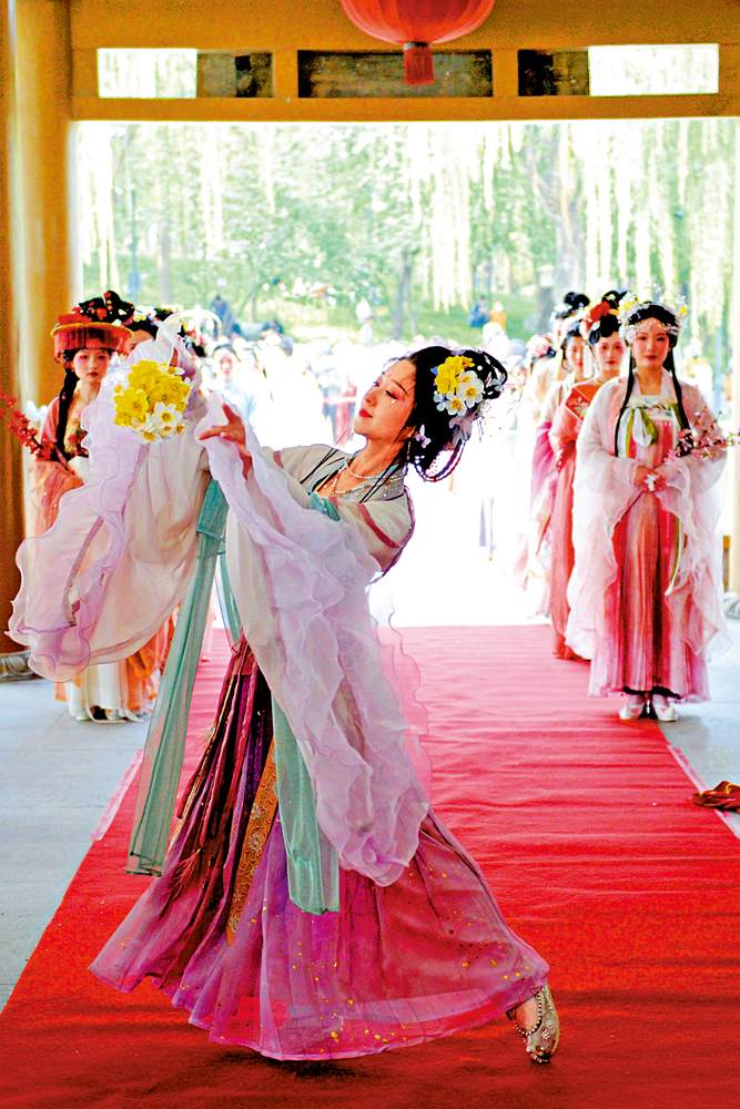 在曲江池遺址公園舉行的「錦繡長安花 曲江麗人行」活動中,翩若驚鴻的十二位花仙緩緩入場,獻禮、讀祝、奠酒、祭祀花神。百花綻放,盛世霓裳,漢服同袍們結伴而行,穿梭於古建築和花叢中,裊裊身姿、翩翩驚鴻,似從畫卷中緩緩走來。