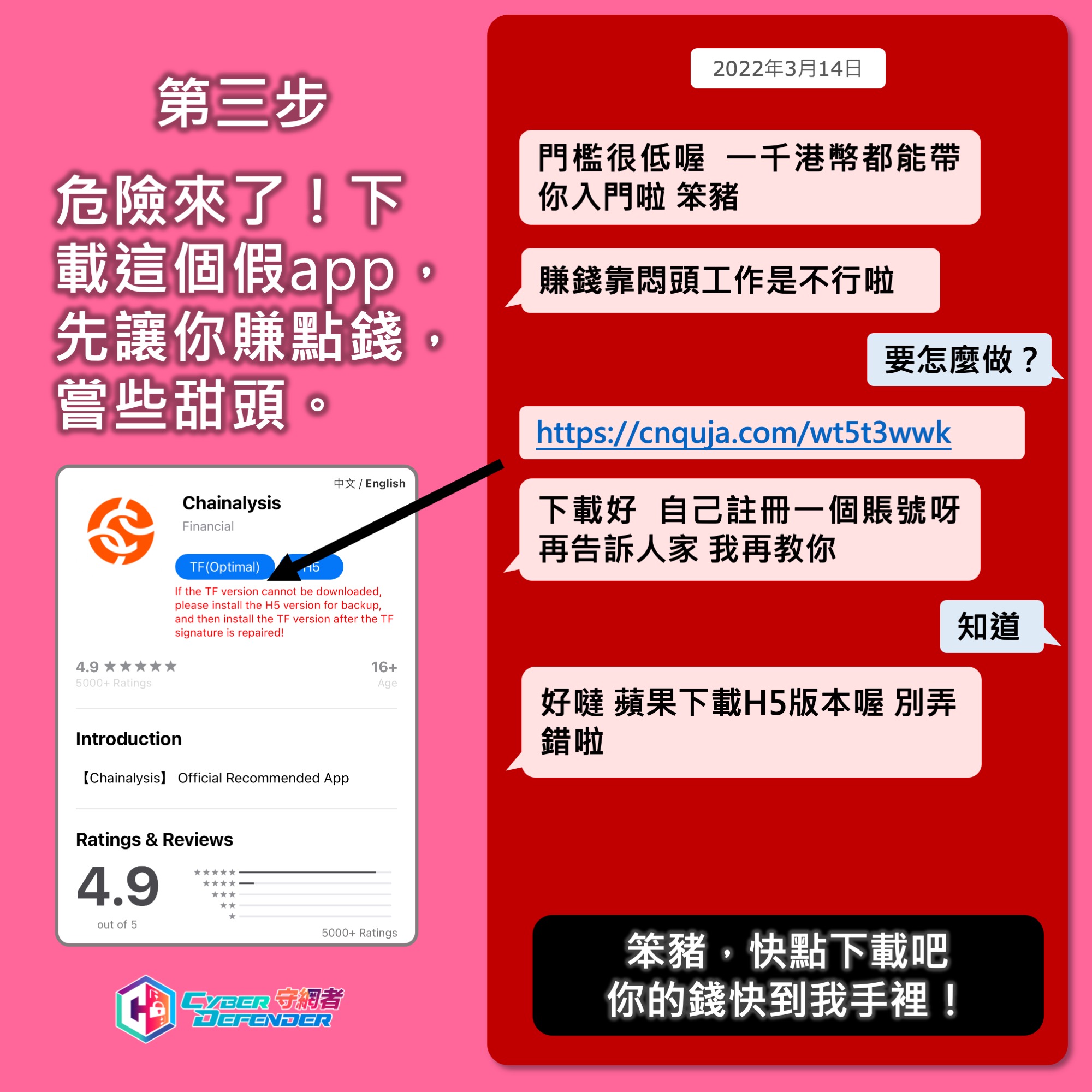 受害人發現被騙與騙徒對質時,對方要稱「若我拿不回來我給你補的資金,別怪我心恨」,威脅會報警。警方呼籲,「當發現甜甜情話,漸變投資謊言,想氹你入局,就記得同佢講聲『睬你都傻』!」