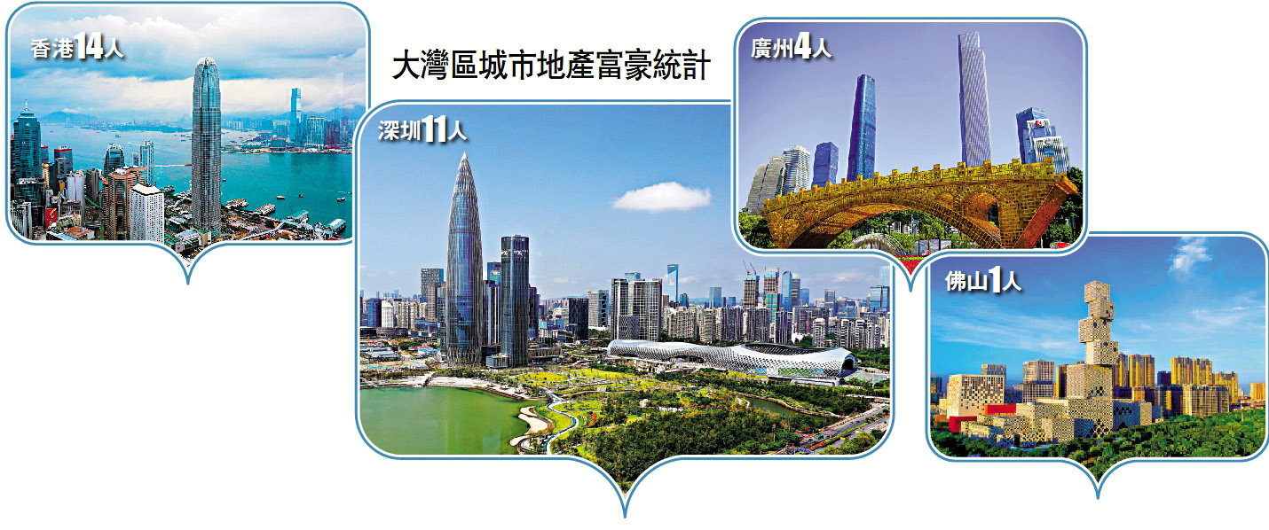 榜單中房地產企業家的財富主要來源於房地產行業,財富計算的截止日期為今年1月14日。榜單中大灣區的富豪,香港共有14位,成為最多前百房地產企業家的城市;深圳有11位排第2,廣州有4位上榜排名第6。此外,有1位來自佛山。