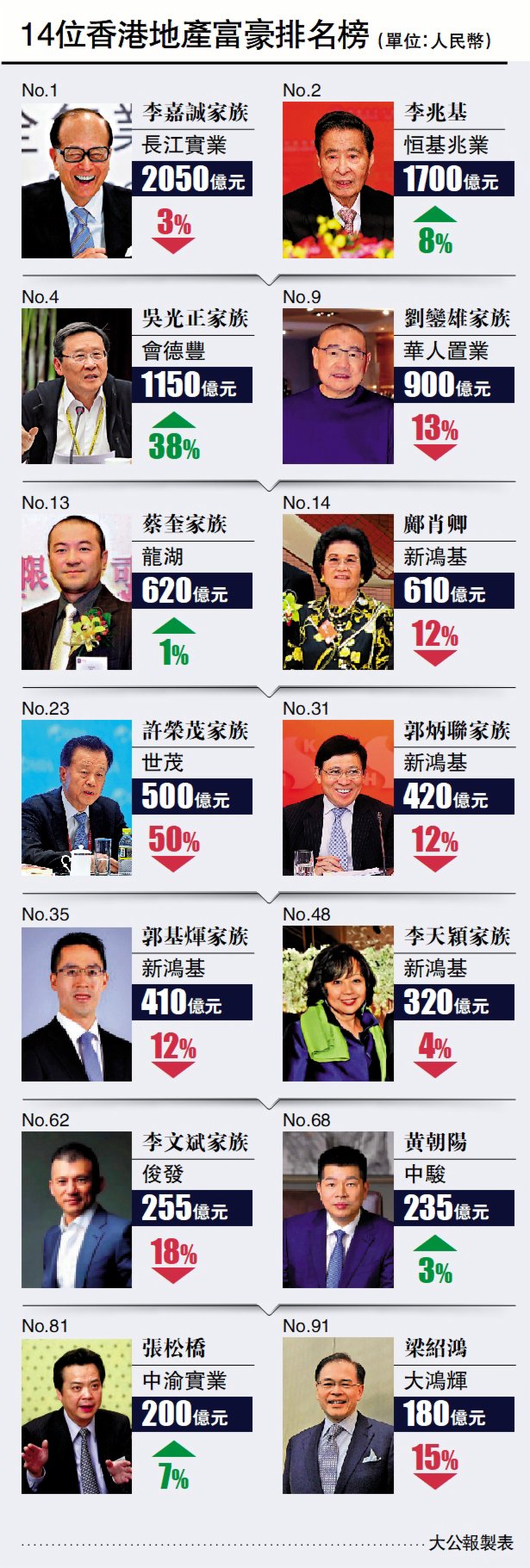 富豪榜首三位分別為長實李嘉誠、恒地李兆基、碧桂園楊惠妍家族,身家分別達到2050億人民幣(約2460億港元)、1700億人民幣(2040億港元)、1650億人民幣(約1980億港元),會德豐吳光正為去年財富增長最多的房地產企業家,財富按年增長300億人民幣(約360億港元),總身家增至1150億人民幣(約1380億港元)排名躍升至第四。