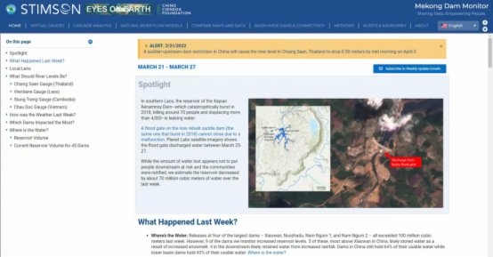 2020年12月,由史汀生中心牽頭組建、「地球之眼」為合作夥伴的「湄公河大壩監測」項目正式啟動,並在形式上仿照美戰略與國際問題研究中心為插手南海問題而啟動的「亞洲海事透明倡議」。該項目的在線監測平台利用遙感、衛星圖像和GIS(地理信息系統)手段,獲取所謂的自然流量,即推算無上游中國大壩條件下的天然流量。該平台收集湄公河流域的水壩信息、流域溫度、濕度和降水信息,記錄中國瀾滄江梯級水庫動態,通過美國國防氣象衛星監測收集湄公河流域地面信息,並通過算法轉化為清盛斷面(泰國清盛水文站為瀾滄江流出中國國境後的第一個水文站)的水位數據。此外,史汀生中心還建設了湄公河流域基礎設施項目追蹤監測平台,監視的內容主要是能源、交通和水利基礎設施的全面信息來源。
