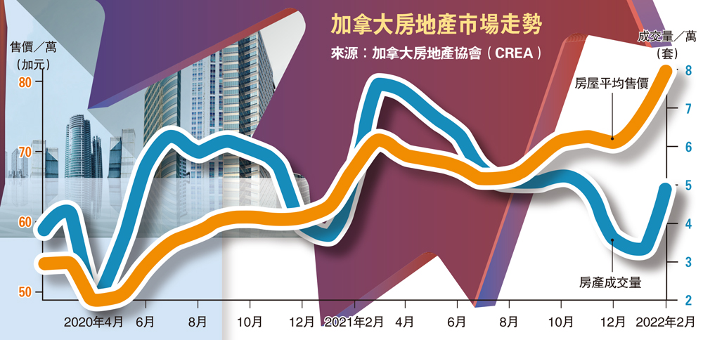 過去兩年,加拿大樓價上升逾50%,今年2月,該國MLS房屋基準價格漲幅創下房地產市場最高紀錄,按月同比增長25%,升至約869300萬加元(約543萬港元)。2月份平均房價也達到創紀錄的816720加元,同比上漲20.6%。