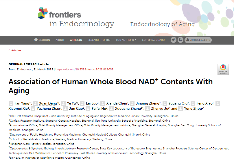 據介紹,這一研究《Association of Human Whole Blood NAD+ Contents With Aging》(人血液中 NAD+ 水平與衰老的關係)是由上海交通大學醫學院附屬第一人民醫院、暨南大學、湯臣倍健營養健康研究院共同主導,全國多家知名高校與科研機構聯合開展。該項研究的發現,完善了NAD+與衰老關係在大型人群中的研究缺口——性別差異性,為NAD+與衰老研究帶來新思路。
