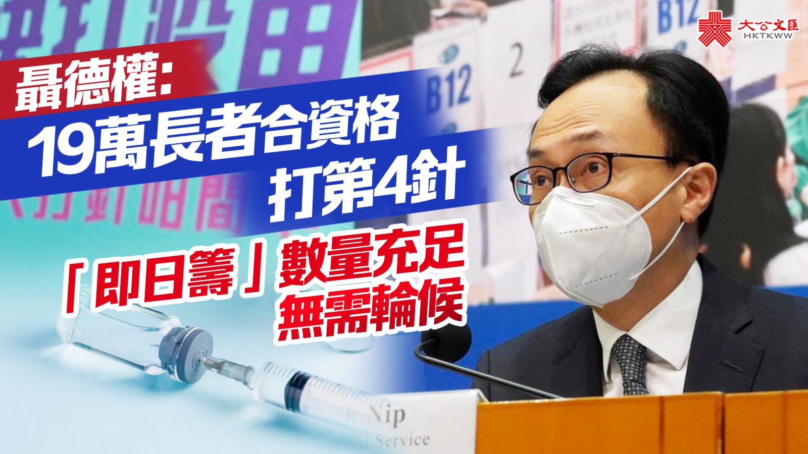 大公文匯全媒體報道,政府今日(8日)宣布,所有合資格年滿60歲的人士,即日起可到社區疫苗接種中心,或者公立醫院的疫苗接種站領取「即日籌」,接種第4針疫苗。公務員事務局局長聶德權在社交平台發文指,截至今日,全港約有19萬名長者合資格打第4針。另外,估計現時仍有37萬名老友記從未接種疫苗,他懇請各位關愛長者的家人、朋友們,盡早為他們安排接種。