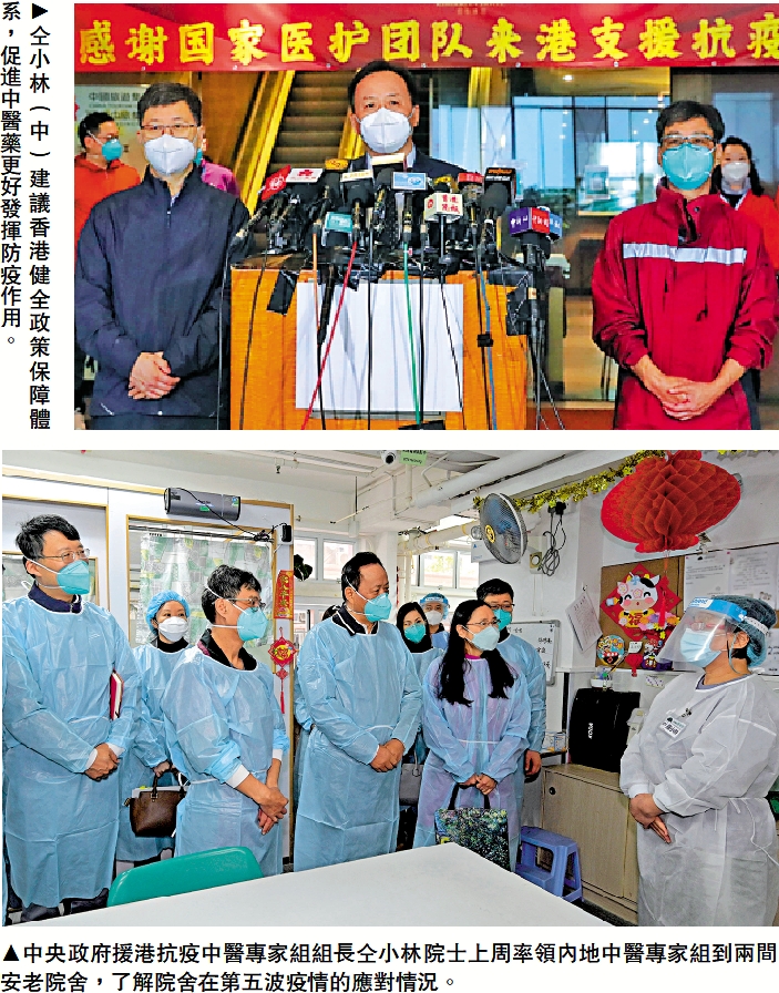 仝小林表示,特區政府在特殊時期採取非常手段,積極創新,形成多個有效的突破:一是兩個「豁免」,即為內地醫療隊處方權的註冊提供豁免,為內地捐贈的多種抗疫中成藥在香港使用的註冊提供豁免;二是四個「共同」,即中醫進入收治新冠病人的「紅區」,與西醫共同組建隊伍、共同收治病人、共同值班查房、共同制定方案;三是中央援港抗疫中醫專家與定點醫院深切治療部的西醫專家一起討論危重症病例。