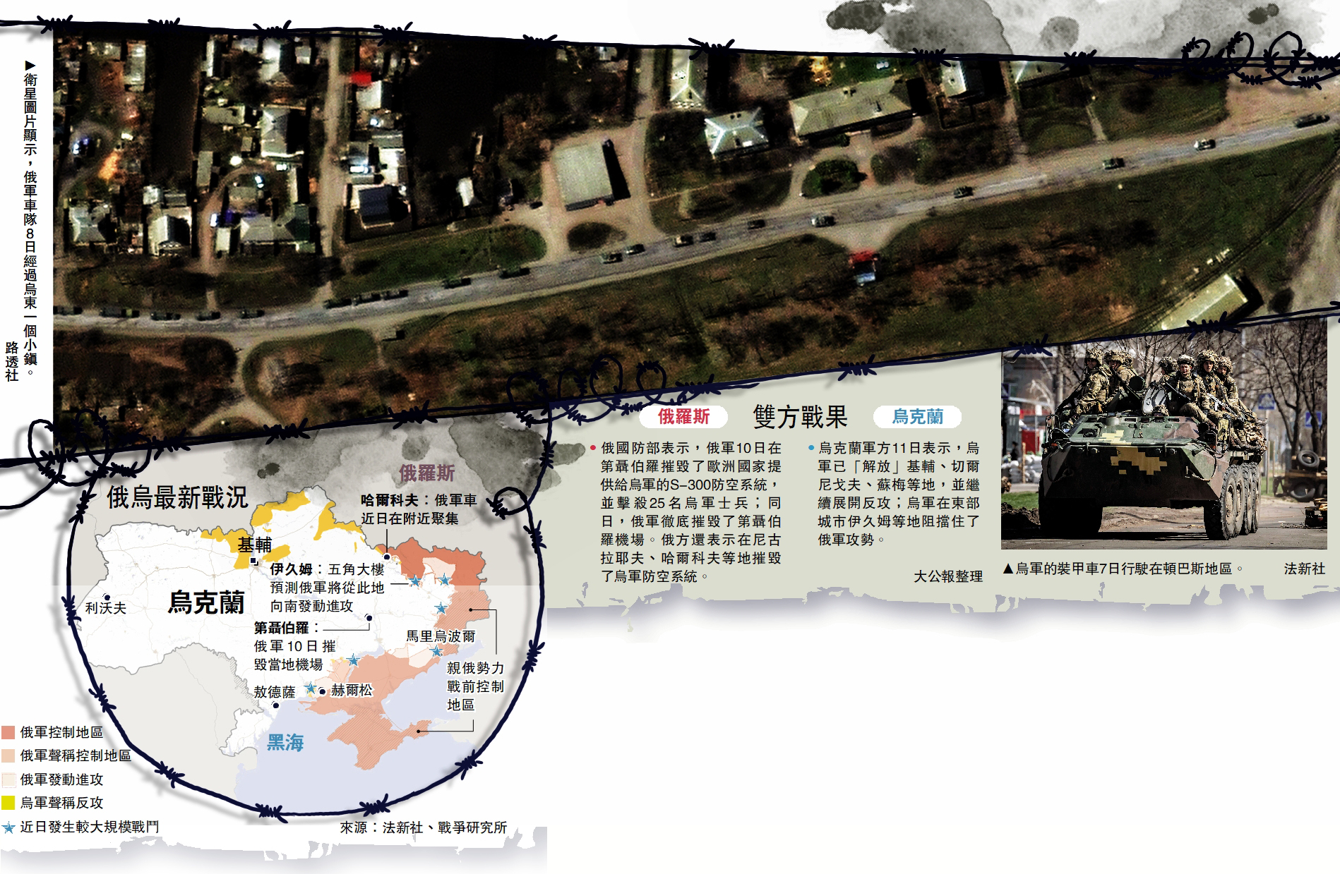 《華爾街日報》10日報道指,俄軍近日將從烏克蘭首都基輔周邊撤回的兵力重新部署到烏東地區,還增派了大量坦克、火炮等武器,以奪取烏東尚未被莫斯科控制的地區。衛星圖片顯示,綿延13公里的俄軍車隊8日經過烏東大布爾盧克鎮,一路向南駛向哈爾科夫。與此同時,烏克蘭也把北部的兵力調派到烏東。雙方在伊久姆、馬里烏波爾等位於俄烏控制區域交界線上的城市頻繁交火。
