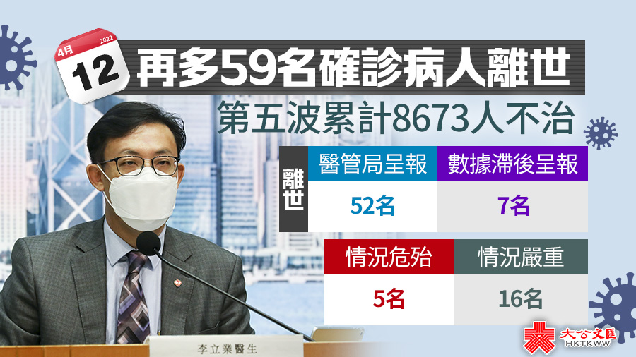 醫管局總行政經理(綜合臨床服務)李立業公布,截至今日零時,過去24小時醫管局呈報52名確診病人離世,涉及29男23女,年齡介乎47至106歲,當中29人來自院舍,29人無打針資料,2位較年輕的離世病人均患有長期病患。另外因為數據滯後,今日再呈報4月10日的7名離世病人,均為女性,年齡介乎85至98歲。