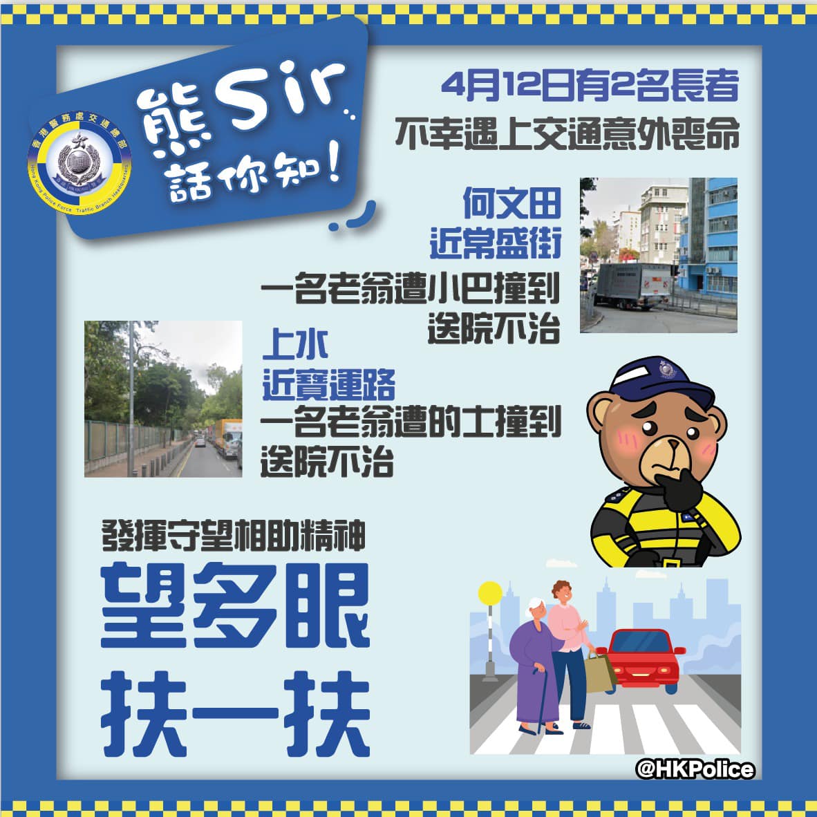 警方提醒,馬路如虎口,各位老友記在過馬路時要遵守交通規則。道路安全,人人有責,市民應該發揮守望相助的精神,多留意及照顧身邊的人,尤其是長者,適當的時候「望多眼,扶一扶」,避免意外發生。