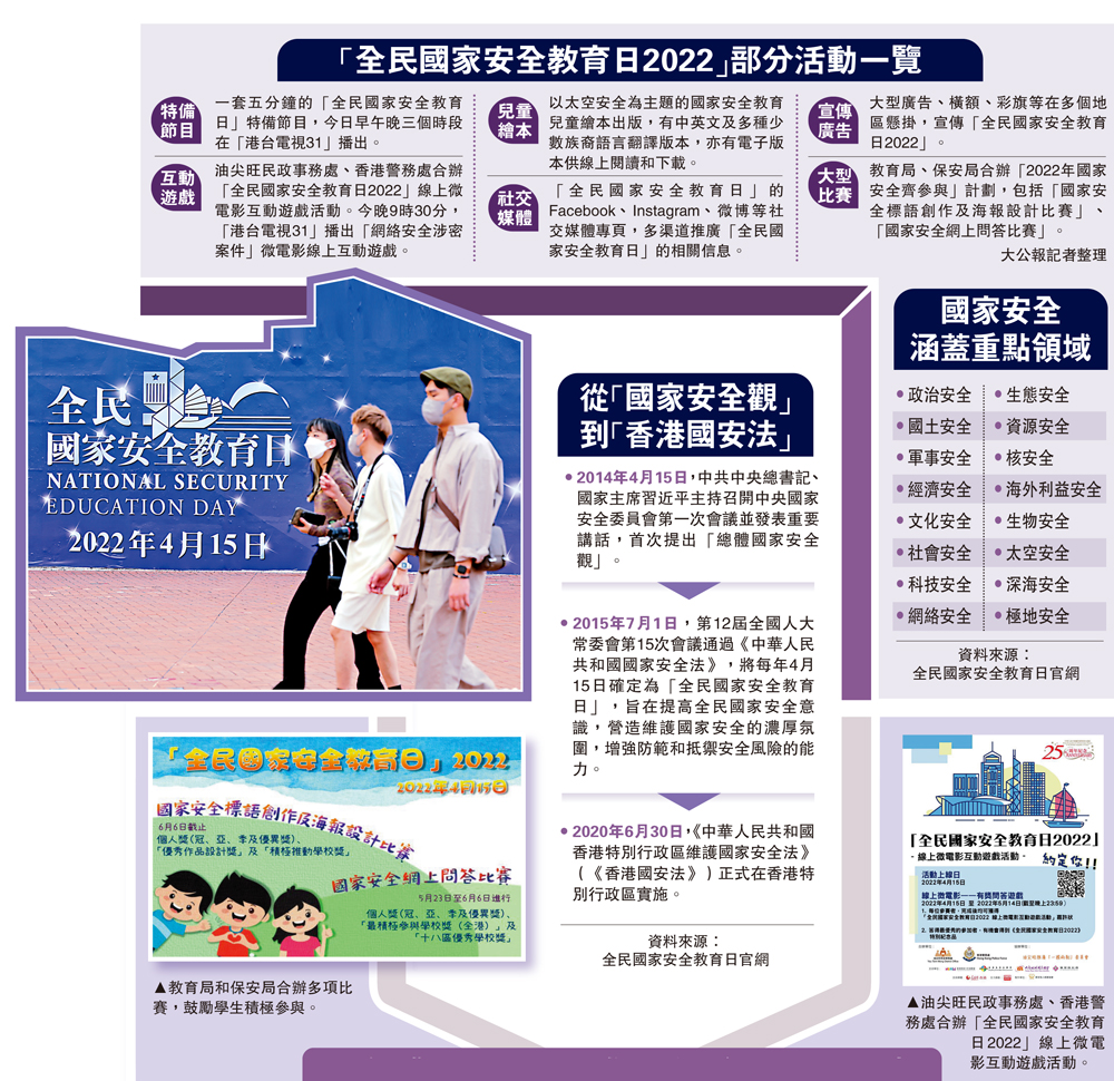 (大公報 記者 龔學鳴)今日是香港國安法實施後的第二個「全民國家安全教育日」,今年的主題為「國家安全 護我家園」,疫情之下,相關活動多在線上舉行,重頭戲為一齣五分鐘的特備節目,今日早午晚三個時段在「港台電視31」播出,還有以太空安全為主題的國家安全教育兒童繪本,推出電子版本供線上閱讀和下載。