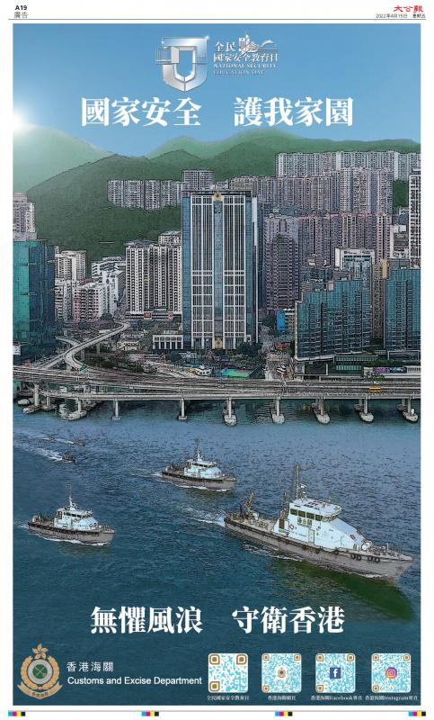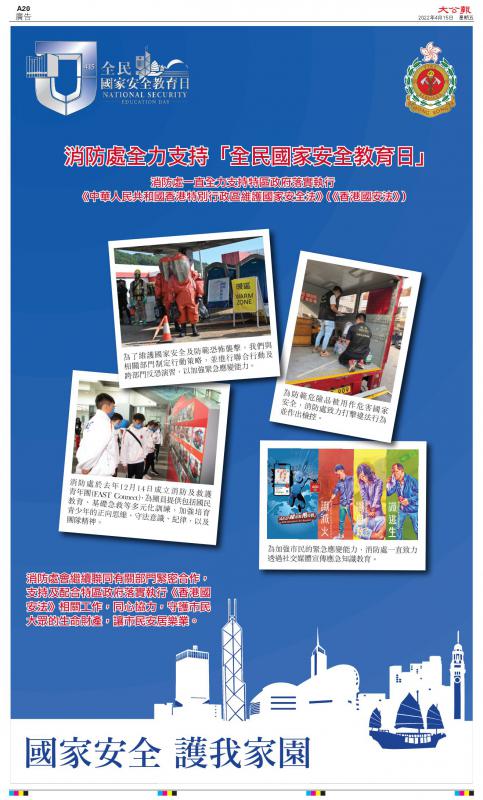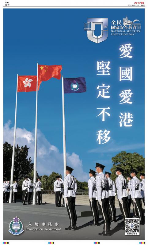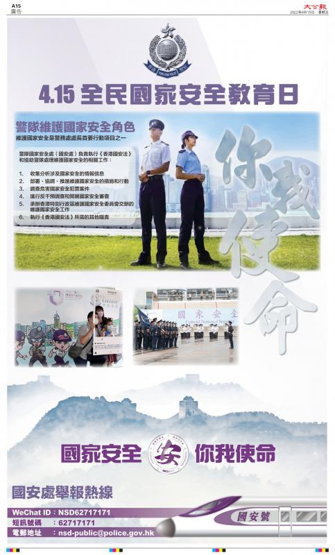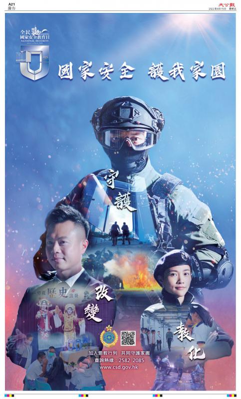 今日(15日)是《香港國安法》實施後第二個「全民國家安全教育日」,亦是香港特區維護國家安全委員會第二次舉行「全民國家安全教育日」,主題為「國家安全 護我家園」,旨在提高全港市民的國家安全意識,營造維護國家安全的濃厚氛圍,並藉此培養更強的國民身份認同。六大紀律部隊今日刊出海報,支持「全民國家安全教育日」活動,守護國家安全。