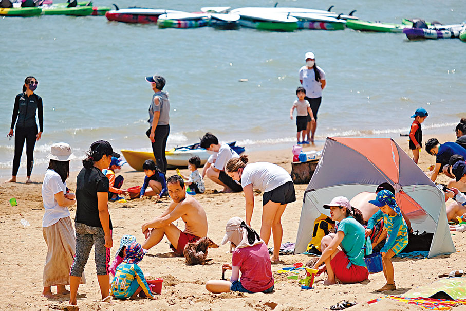 西九文化區昨日亦有巿民一家大細到場遊玩,草地有多個帳篷,不少巿民聚集野餐,部分四五人圍坐,既未有遵守「限聚令」,更脫下口罩進食。有警員在場巡視,提醒遊人要保持社交距離和遵守「口罩令」。康文署旗下的泳灘雖然封閉,但其他泳灘亦聚滿不少弄潮兒,同樣也有不少人一起遊玩,違反「限聚令」。