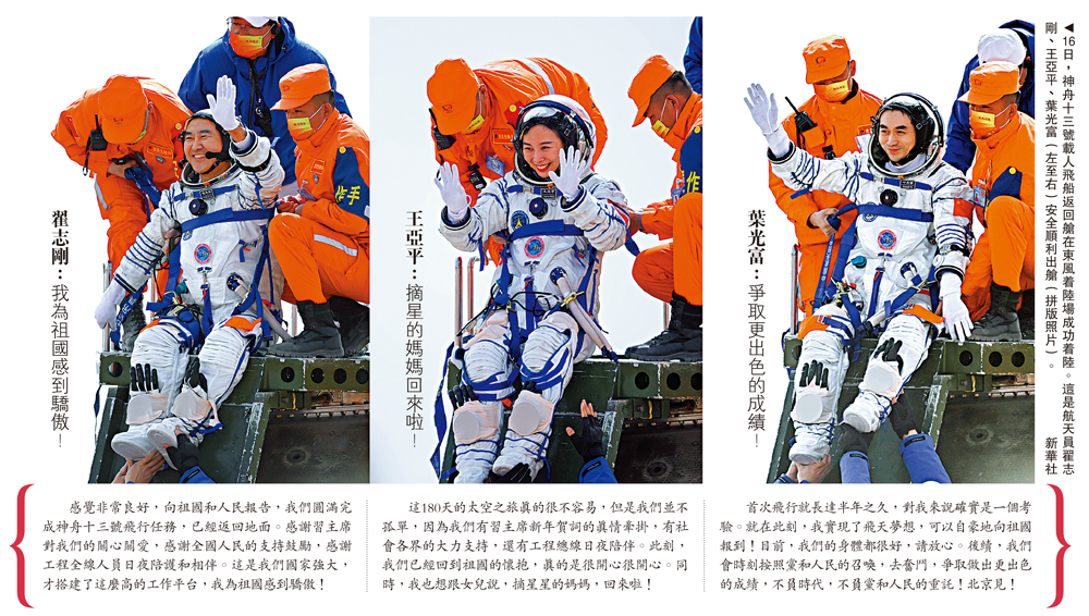 (大公報記者 劉凝哲)歷經183天的太空飛行,神舟十三號航天員翟志剛、王亞平、葉光富告別中國空間站,乘坐載人飛船返回艙在2022年4月16日9時56分於內蒙古東風着陸場成功着陸,三人身體狀態良好,任務取得圓滿成功。三人凱旋抵京後,承諾為小女兒「摘星星」的王亞平立刻兌現承諾,掏出一顆「星星」送給女兒。神舟十三號載人飛行任務的圓滿成功,標誌着空間站關鍵技術驗證階段任務圓滿完成,中國空間站即將進入建造階段。