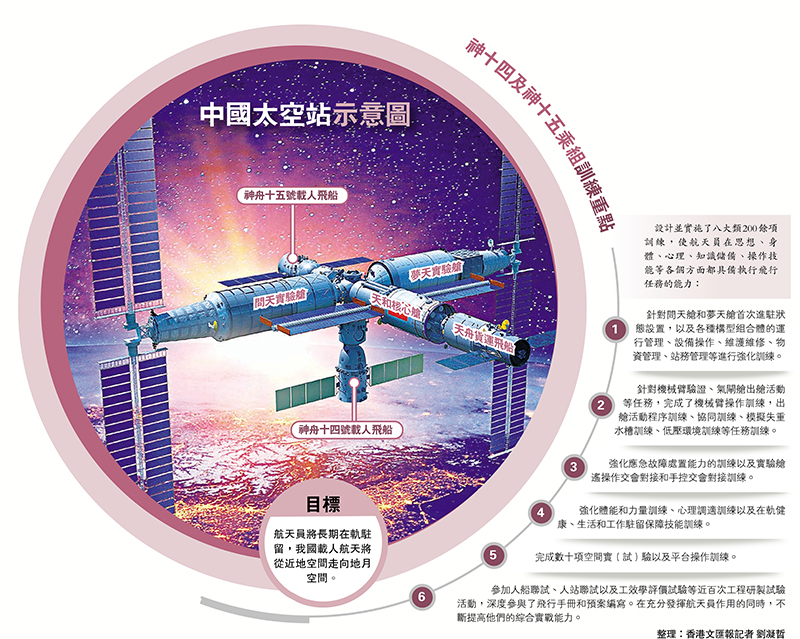 黃偉芬介紹,神十四乘組將配合地面完成太空站組裝建設工作,從單艙組合體飛行逐步建成三艙組合體飛行狀態,在這期間要經歷9種組合體構型、5次交會對接、3次分離撤離和2次轉位任務。他們將首次進駐問天實驗艙和夢天實驗艙,建立載人環境;配合地面開展兩艙組合體、三艙組合體、大小機械臂測試,氣閘艙出艙相關功能測試等工作。首次利用氣閘艙實施出艙活動。完成問天實驗艙和夢天實驗艙14個機櫃解鎖、安裝等工作。