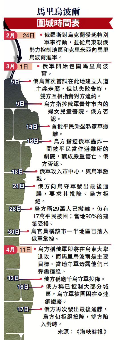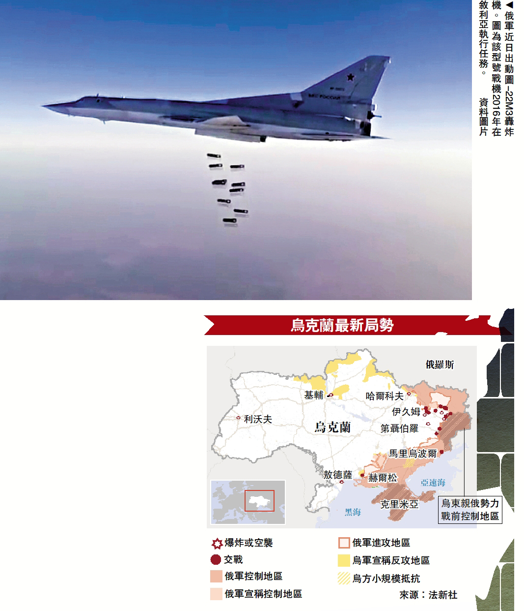 【大公報綜合美聯社、今日俄羅斯報道】美媒稱,俄羅斯黑海艦隊旗艦「莫斯科」號沉沒後,俄軍18日對烏克蘭進行了迄今最大規模的打擊,擊中數百個軍事目標。烏克蘭西部城市利沃夫據報遭到5枚導彈襲擊,至少7人死亡,另有11人受傷。另外,俄軍近日猛攻烏東南重鎮馬里烏波爾守軍的最後陣地亞速鋼鐵廠,首次出動了便攜式導彈夠不到、S-300防空系統難對付的圖-22M3「逆火」戰略轟炸機。