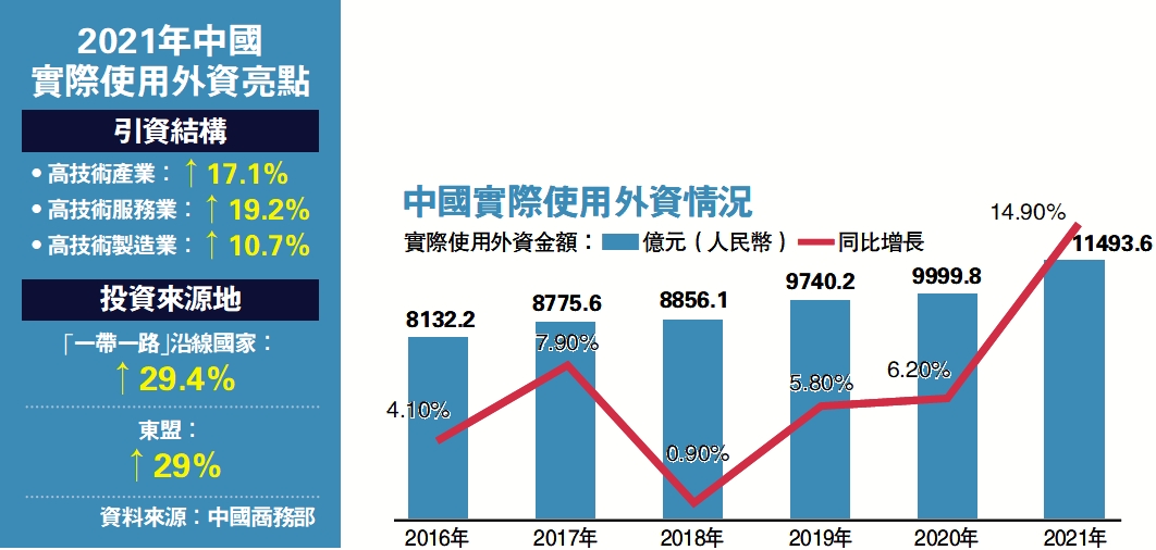 《報告》指,亞洲吸引外資能力在不斷增強,2021年吸引的外商直接投資達6960億美元,相比2020年增長18%。亞洲的主要外資仍來源於亞洲內部,在雙邊跨境投資依存方面,中國內地與香港相互依賴程度最高,中國內地對香港的外商直接投資流入和流出依存度指數為62.64%。
