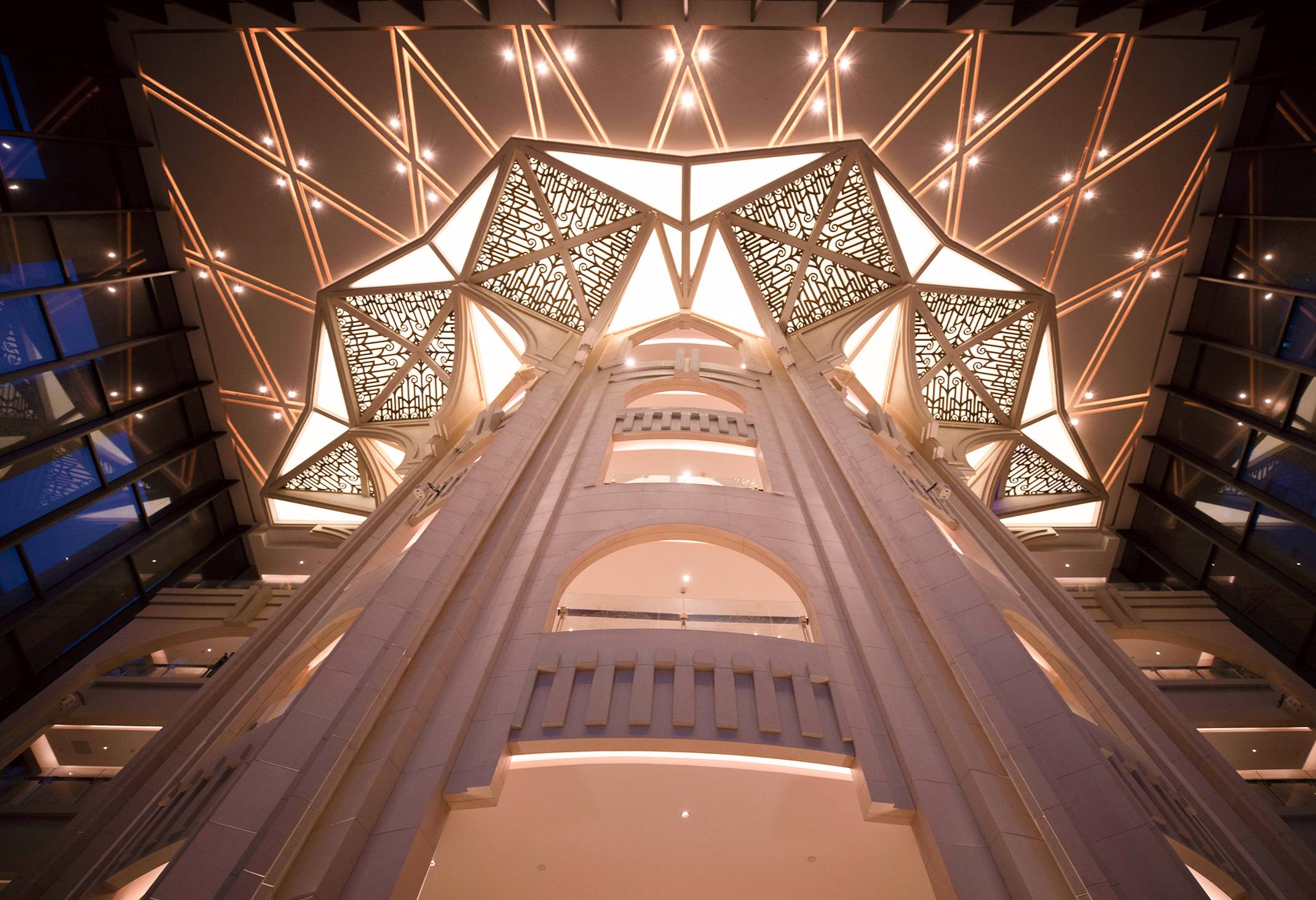 劇場門廳外的18根28米高的立柱,扭轉角度各有不同,如同鳳凰尾羽靈動扭轉之感;極具靈動的橢圓型觀眾廳,螺旋放射,如同鳳凰騰飛時灑下的音樂光芒。劇場色調以與鳳凰匹配的金黃色為主,內部金黃色與紅色相交織的色系組合更加符合中國文化元素與歐洲古典建築風格相融合的理念。總高6.5米、直徑4.5米的華麗精緻的穹頂吊燈,加上金碧輝煌的四壁華美內飾,置身其中極具觀賞歌劇的儀式感。