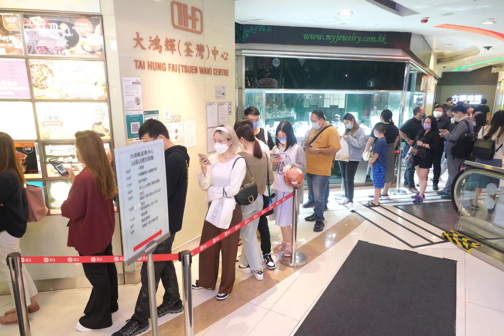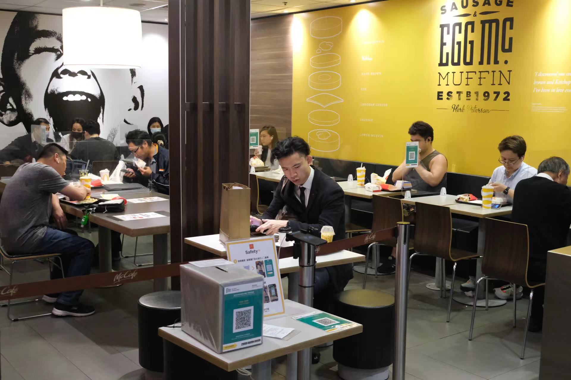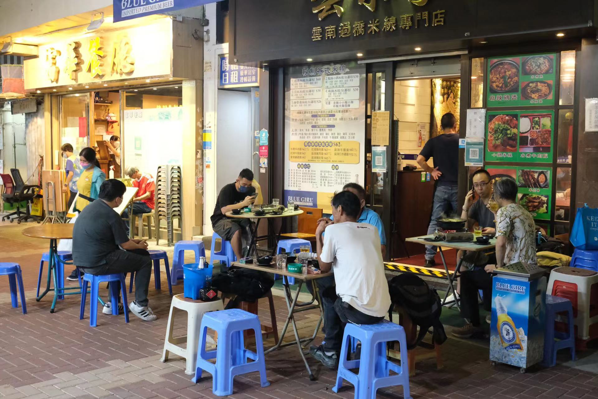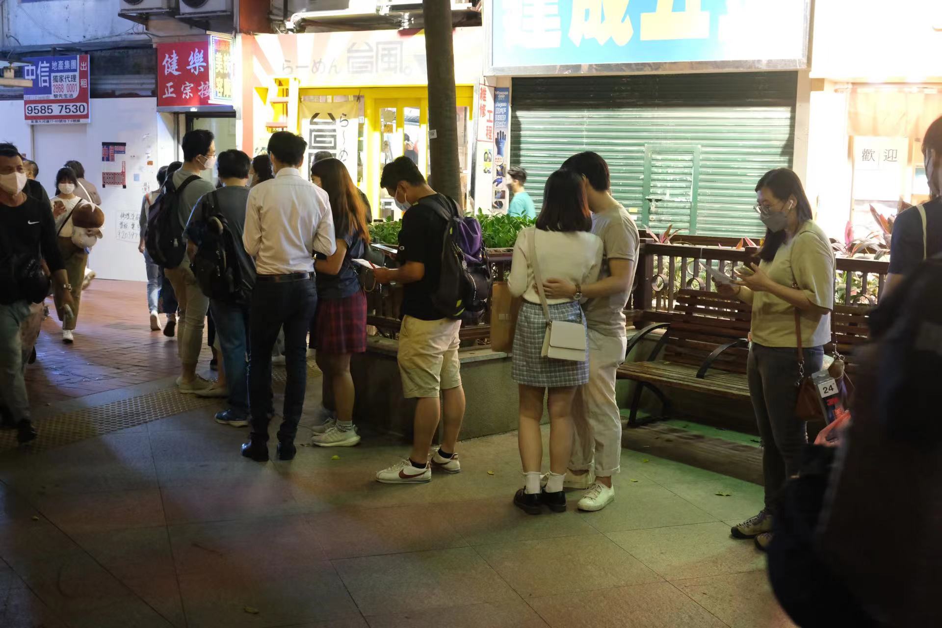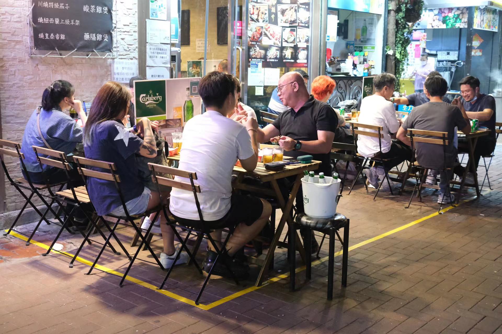 大公文匯全媒體報道,政府今日(21日)起分階段逐步放寬社交距離措施,包括食肆恢復晚市堂食至晚上10時,且放寬至4人一枱。大公文匯全媒體記者走訪市區發現,不少食肆的晚市時段都出現排隊人龍,餐廳內亦幾近坐滿,部分市民更選擇與親朋好友開心聚餐,同坐一枱,不過就以4人為限。此外,食肆周邊處處可見張貼「安心出行」二維碼,讓市民能配合防疫措施。