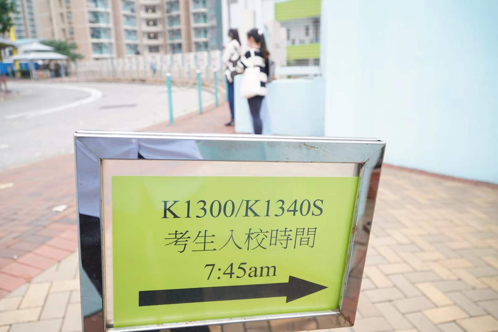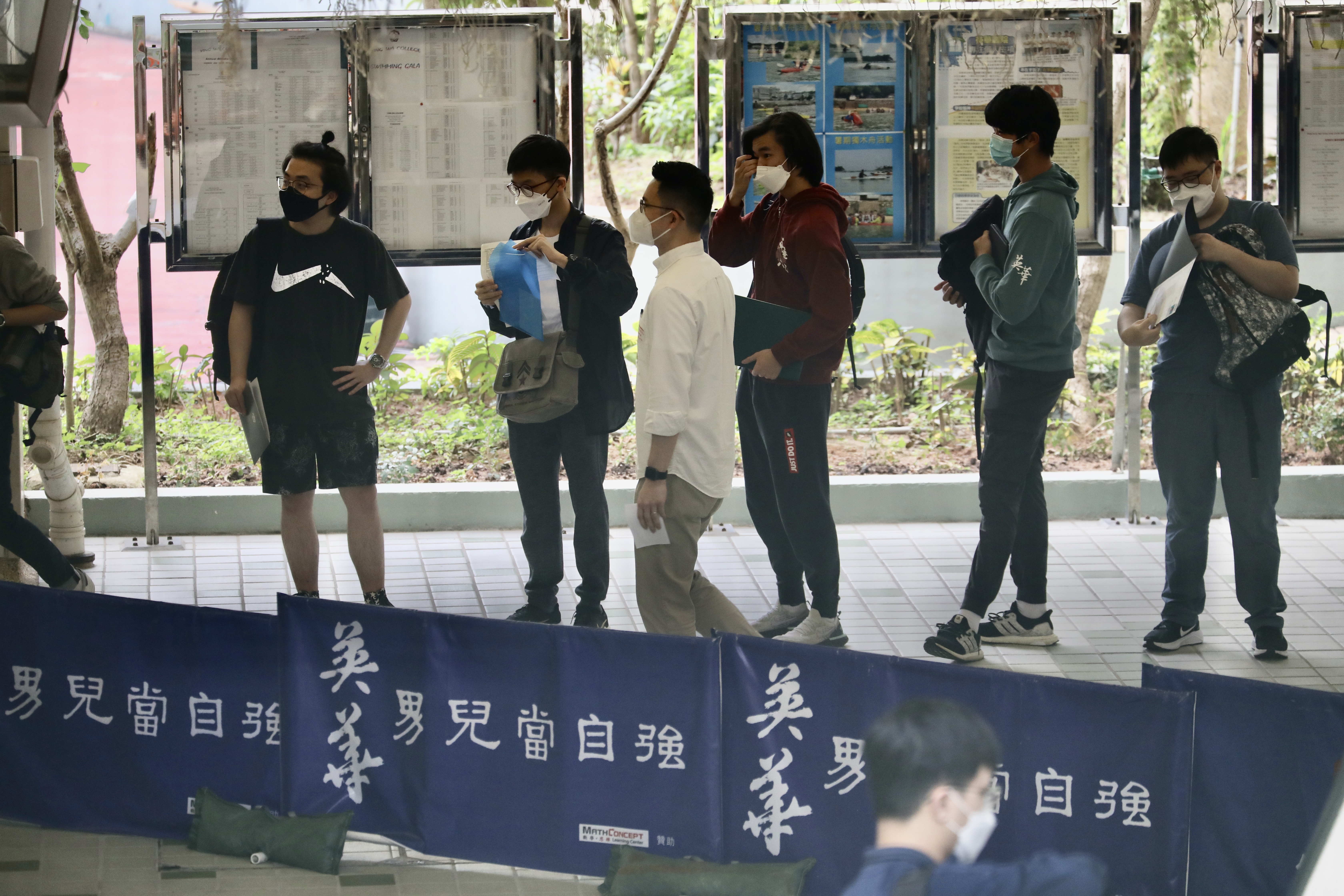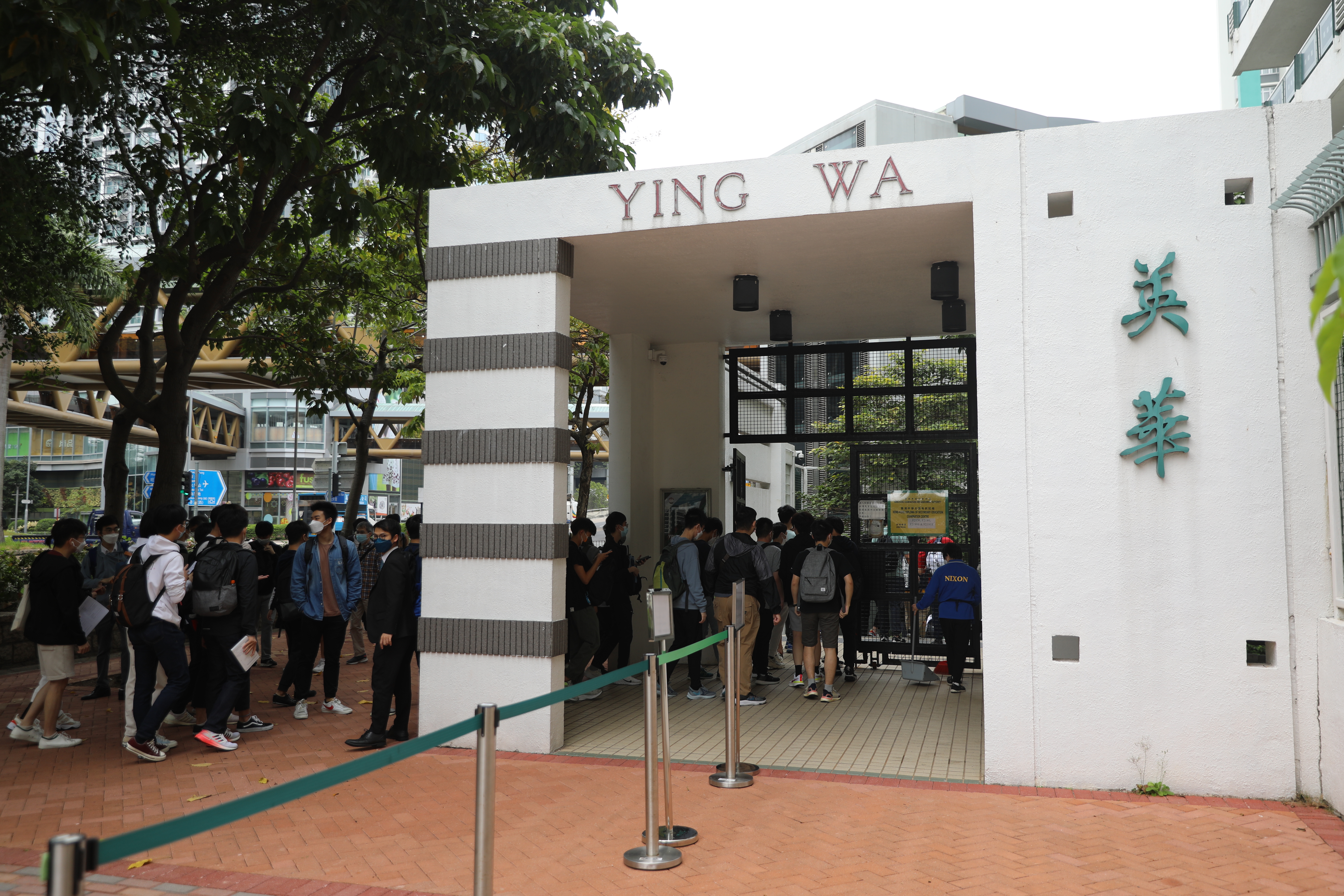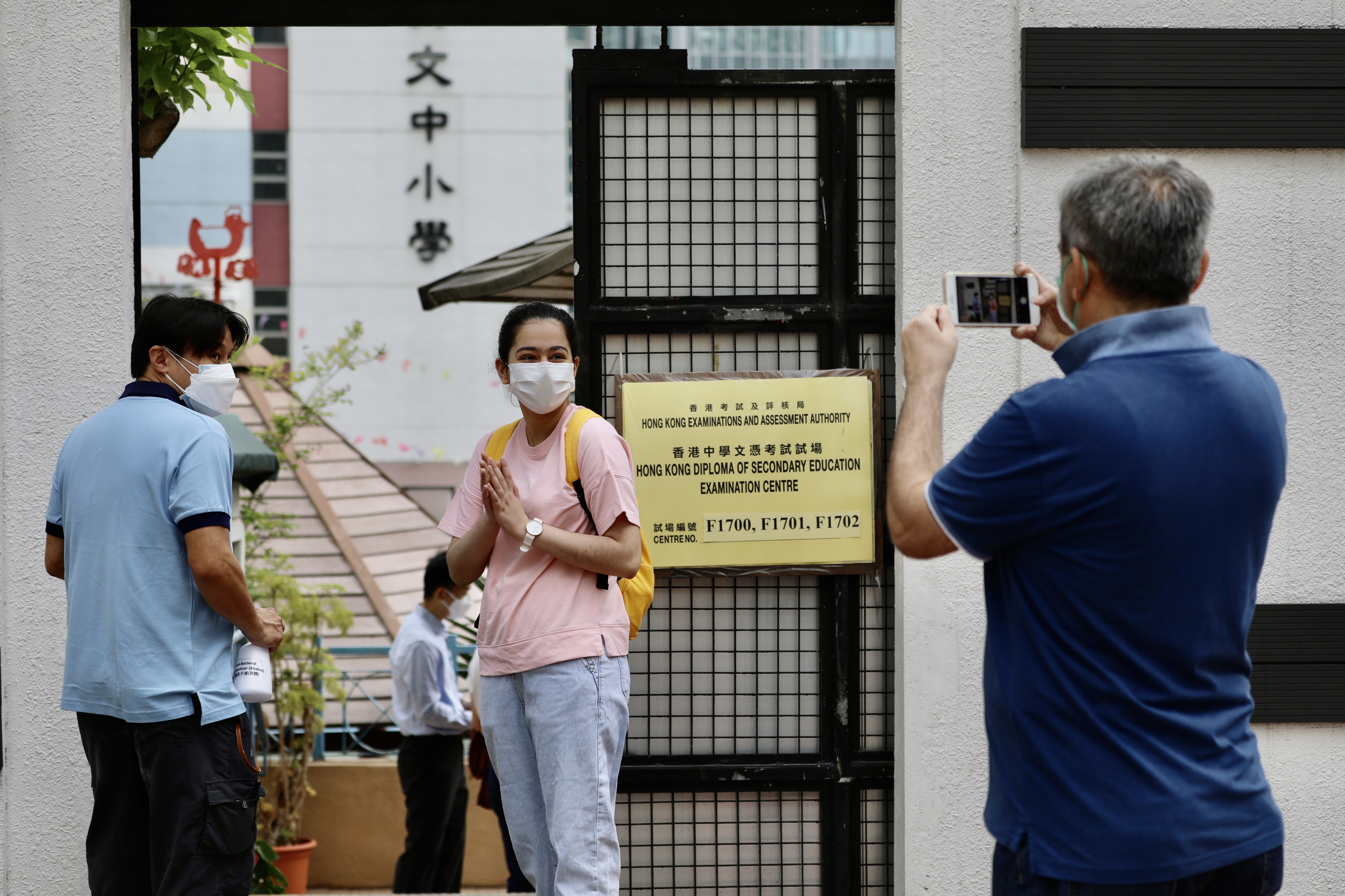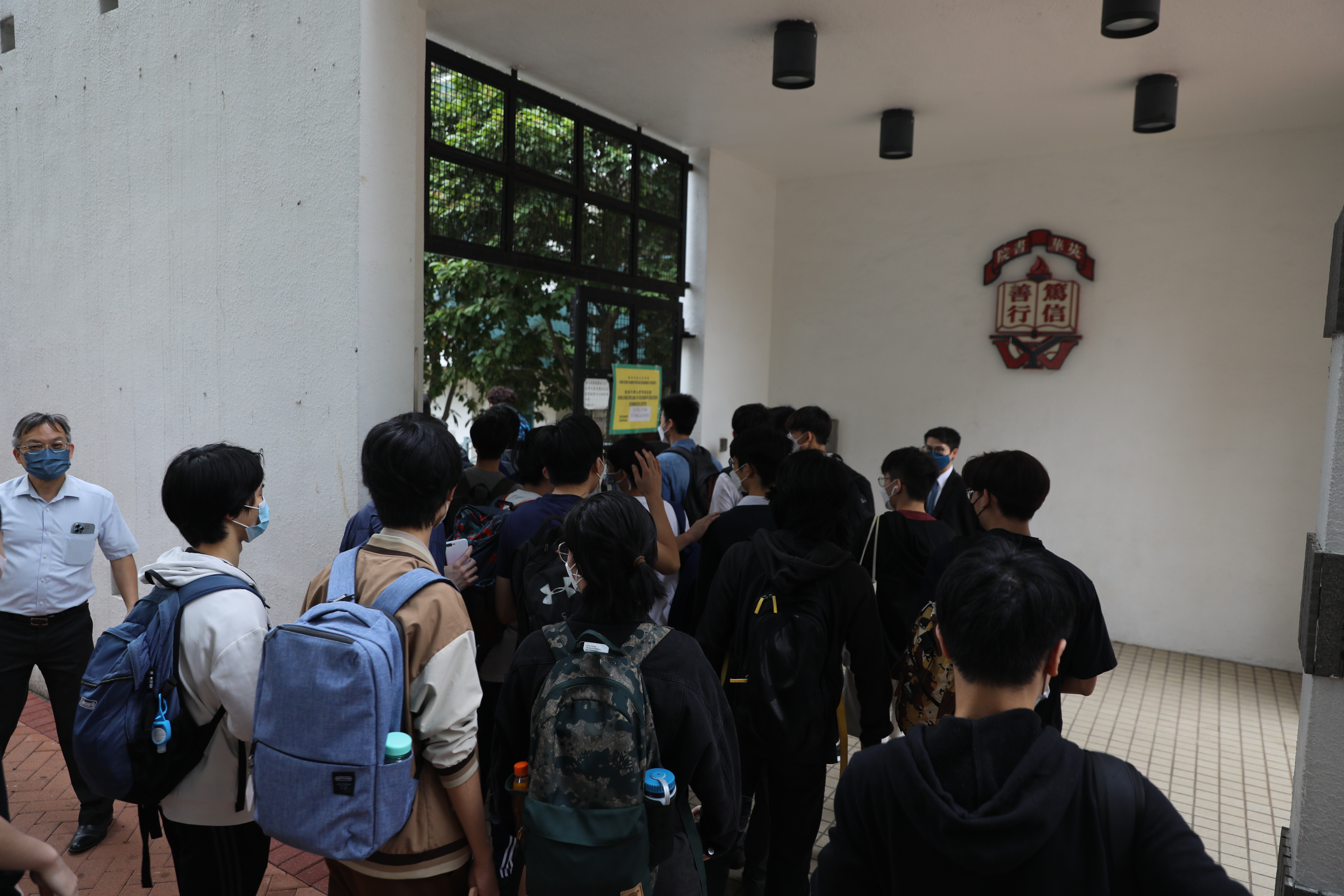 今日是英國語文科考試,開考前有學生在考場外準備考試證件和文具,亦有學生抓緊最後時間溫習知識點,也有家長專程送子女到考場,紀錄寶貴一刻。考試及評核局主席容永祺則到英華書院視察考場並為學生加油打氣。