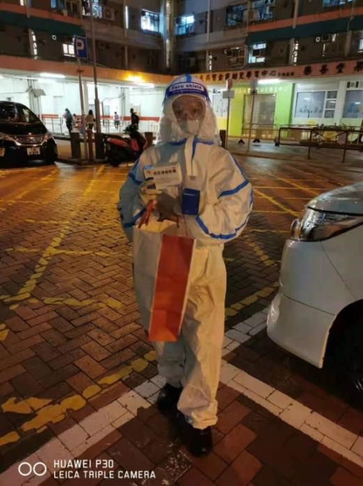 揭艷花的熱心腸也感染了身邊許多朋友,提出要幫忙送貨,但當時沒有足夠的防護服,無法保障義工健康,她婉拒了義工們的好心請求。疫情初期物資短缺,揭艷花有時為了幫患者買到他們所需的用品,要跑幾個區才能買到。隨着疫情蔓延,之前求助的確診患者,幾乎無一倖免全家都感染,而政府公布的求助電話也已接近癱瘓,不少患者陷入彷徨無助的極度驚恐中。那段時間,她經常早上7點就會被求助電話叫醒,匆匆準備一下就出門,為患者服務到深夜零點以後才能回到住處。由於在外做義工都要穿防護服,還要經常爬樓梯去劏房、唐樓送物資,脫下防護服後渾身上下早已被汗水濕透,身軀極度疲憊,但她覺得自己在做有意義的事,第二天又像吃了興奮劑一樣,全力衝在疫情最前線。