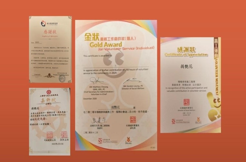 揭艷花的真情付出也得到了社會不同層面的認可和嘉許,包括政府頒發的「2020年度金狀義務工作嘉許狀」、社會福利署「2021年感謝狀」、諾言慈善基金會「2020年感謝狀」和工聯會九龍地區「2022年第五波疫情『抗疫先鋒』嘉許狀」等。