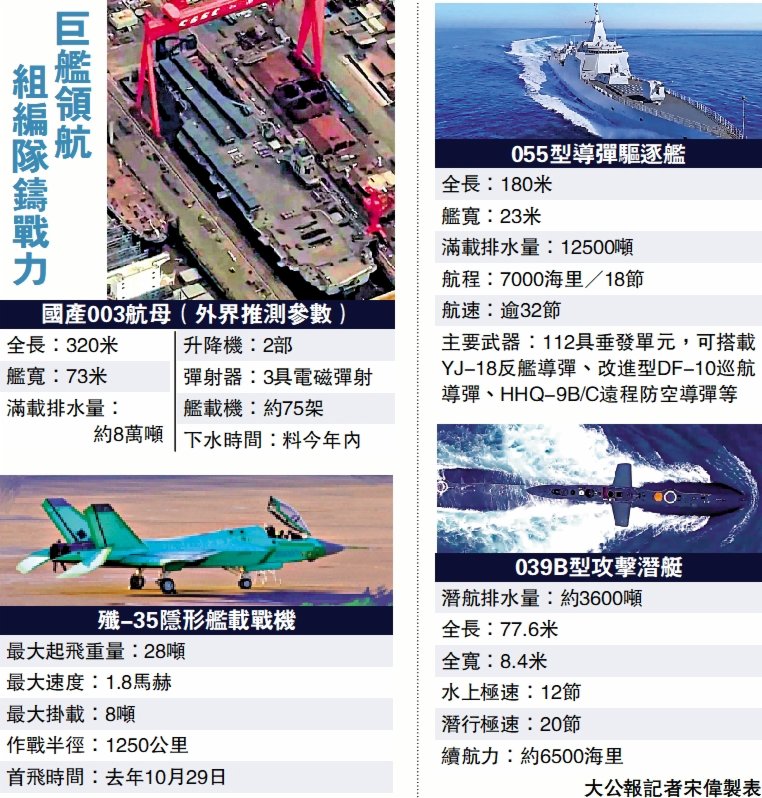 (大公報記者 宋偉)今日是人民海軍成立73周年紀念日。22日,中國軍號、海軍政治工作部宣傳局聯合發布首部航母主題宣傳片《深藍!深藍!》。在片尾「彩蛋」處,一名海軍指戰員接到來自母親的電話,他回應:「三胎?好,安排!」與此同時,鏡頭依次掠過標有「16」「17」的飛行甲板以及一處畫面留白。這是繼2018年11月新華社官微披露中國第三艘航母在建的消息後,海軍官方首次公開預告003航母即將亮相。有軍事專家指出,這艘採用電磁彈射起飛技術的新航母預計將在今年下半年下水,將助海軍大幅提升戰力。