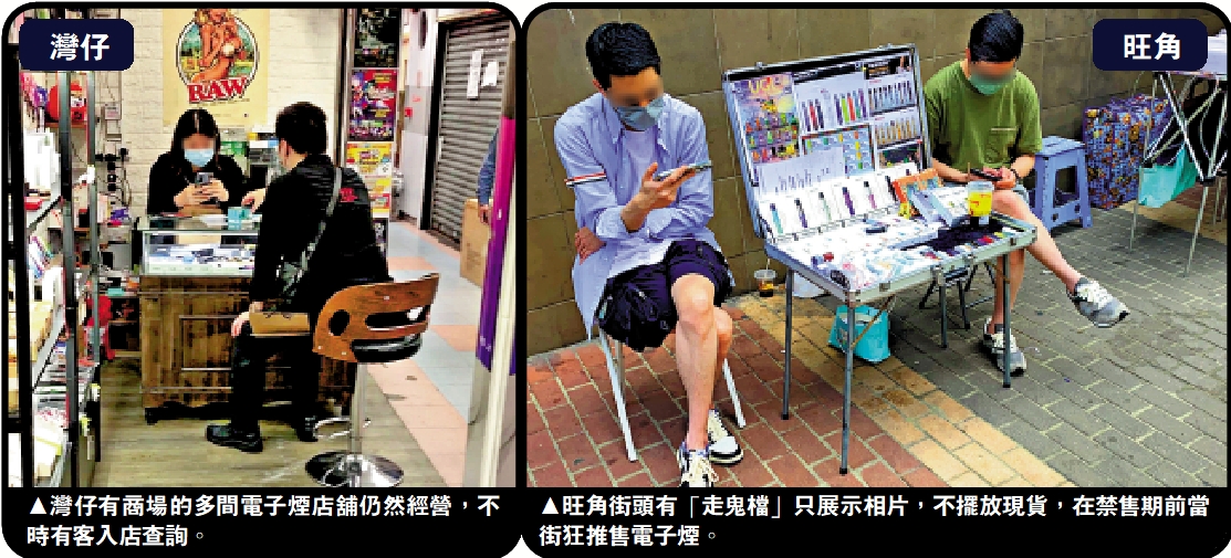 【大公報記者 盛德文、黃山、蘇荣(文) 盧剛昌(圖)】現時全港約有20萬人吸食電子煙。由本周六(30日)起,本港將全面禁售及禁宣傳電子煙、加熱煙等另類吸煙產品。大公報記者近日巡訪多區售賣電子煙的熱門商場,發現多間店舖出「怪招」散貨,包括「買一送一」促銷、在街邊擺「走鬼檔」,以及聲稱轉做線上交易,引誘煙民幫襯。
