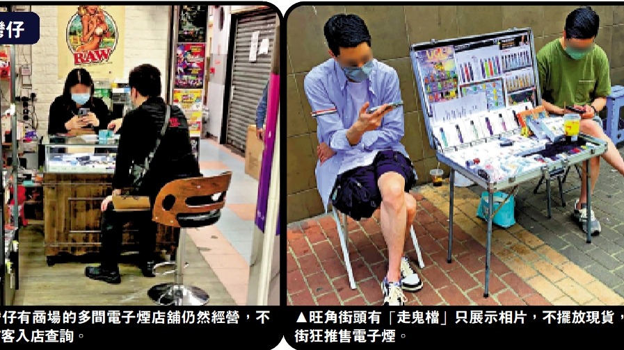 不過,在西洋菜街銀行中心附近,記者見到有「走鬼檔」兜售電子煙,小販非常謹慎,只有相片,攤檔沒有展示貨物,客人看圖選好後,才在附近交貨。