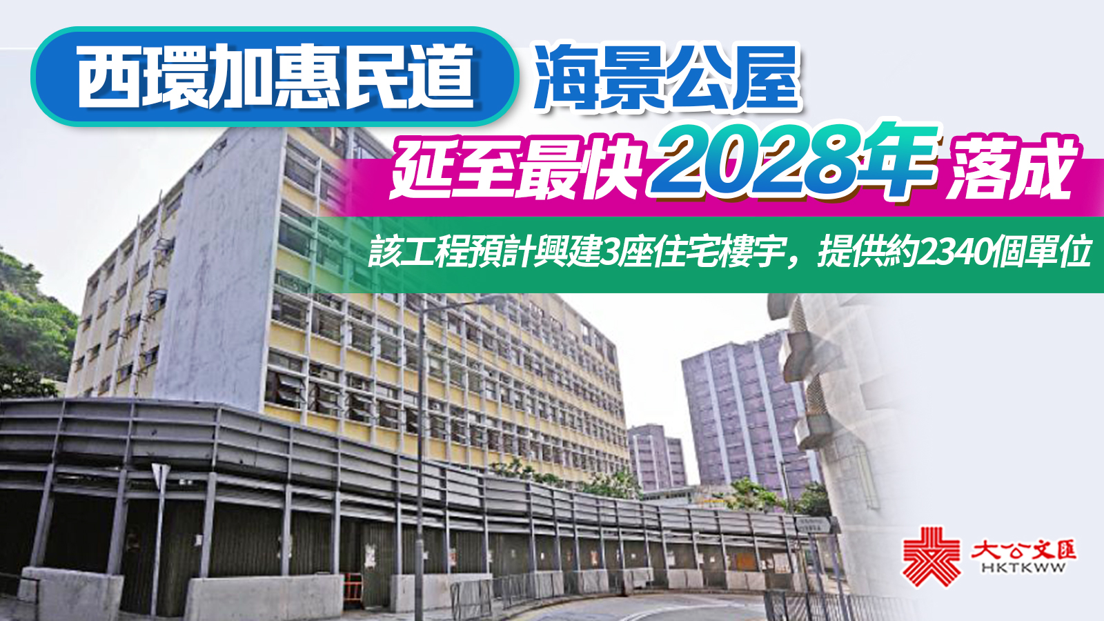 大公文匯全媒體報道,政府有意在堅尼地城加惠民道及前摩星嶺平房區興建公屋,原計劃2024年落成,根據立法會文件披露將推遲至2028年分階段完工。該工程預計興建3座住宅樓宇,提供約2340個單位,用於安置受重建影響的西環邨居民,建成後部分單位或可享海景。