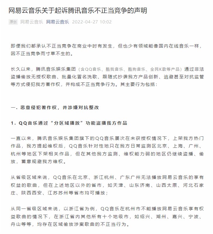 網易雲音樂稱,QQ音樂通過「分區域播放」功能盜播我方作品;騰訊音樂批量化對無授權熱門歌曲冒名洗歌,惡意截流;長期對網易雲音樂的視覺設計、產品功能、創新機制等進行抄襲等。