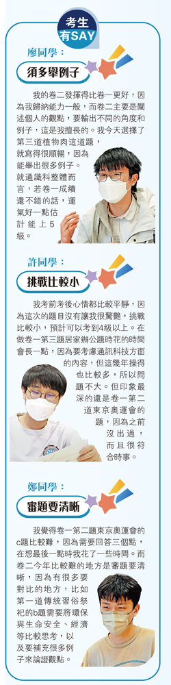 培僑中學6B班鄭偉丞說,今年通識科的議題都貼近生活,比較簡單,比如義工服務。身為學生,他平時也會經常參與相關活動,所以能感同身受。「我之前複習的內容都考到了,屬於正常發揮。但與往年相比,今年卷一沒有出趨勢題,就是通過分析一些數據圖來得出結論,而是純文字描述,讓我有點驚訝。」