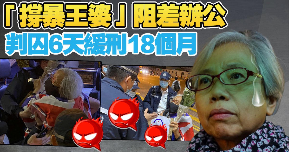 大公文匯全媒體報道,經常招搖於非法集結現場撐暴撐「獨」致官司纏身的示威常客「王婆」王鳳瑤,涉嫌於去年在將軍澳尚德拿着英國國旗及標語「悼念」科大學生周梓樂時,無視警方警告及拒不合作,被帶上警車後,仍高叫「獨口號」,被控一項阻差辦公罪。她昨於觀塘法院承認控罪,判監禁6日,緩刑18個月。