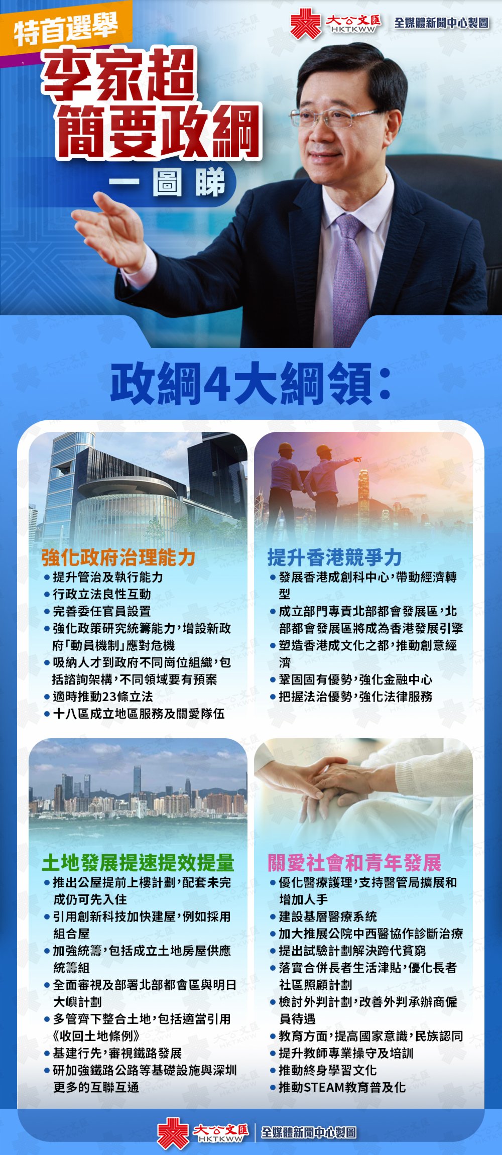 第六屆行政長官選舉將於5月8日舉行,行政長官候選人李家超今早(29日)舉行政綱簡介會。李家超表示,政綱有四大綱領,分別是強化政府治理能力;提速、提效、提量土地及房屋供應;提升本港競爭力;建立關愛社會、重視青年發展。大公文匯網整理了李家超政綱的重點簡要版,供讀者一圖睇清!
