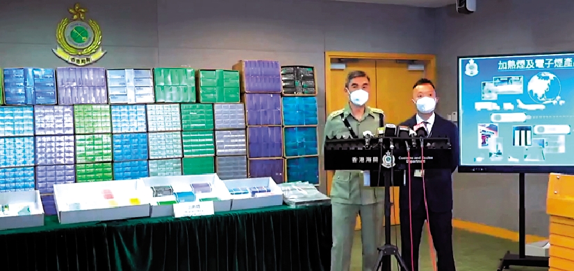 【大公報記者 周亮恒】特區政府刊憲今日起禁止進口、製造、售賣、分發和宣傳電子煙及加熱煙等另類吸煙產品。不法之徒趁《2021年吸煙(公眾衞生)(修訂)條例》生效前從海外購入和囤積居奇,企圖在法例生效後牟暴利。海關過去一個月進行連串執法行動,在各口岸及各區偵破51宗案件,檢獲約260萬支懷疑未完稅加熱煙、19萬支電子煙產品與電子煙油等,總值約1500萬元,估計應課稅值約500萬元。