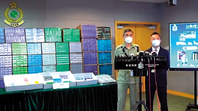 海關通過風險管理及資料分析,在香港國際機場及深圳灣管制站偵破42宗走私案件,主要利用郵包及空運貨物把違禁產品輸入本港,部分則經陸路貨運渠道。海關機場科空運貨物資料研究組指揮官賴恩寧表示,關員揀選可疑郵包和入口貨物作進一步檢查,起出約190萬支懷疑未完稅加熱煙,19萬支懷疑含尼古丁成分的電子煙產品及5000毫升電子煙油,成功堵截該批貨物流入本地。