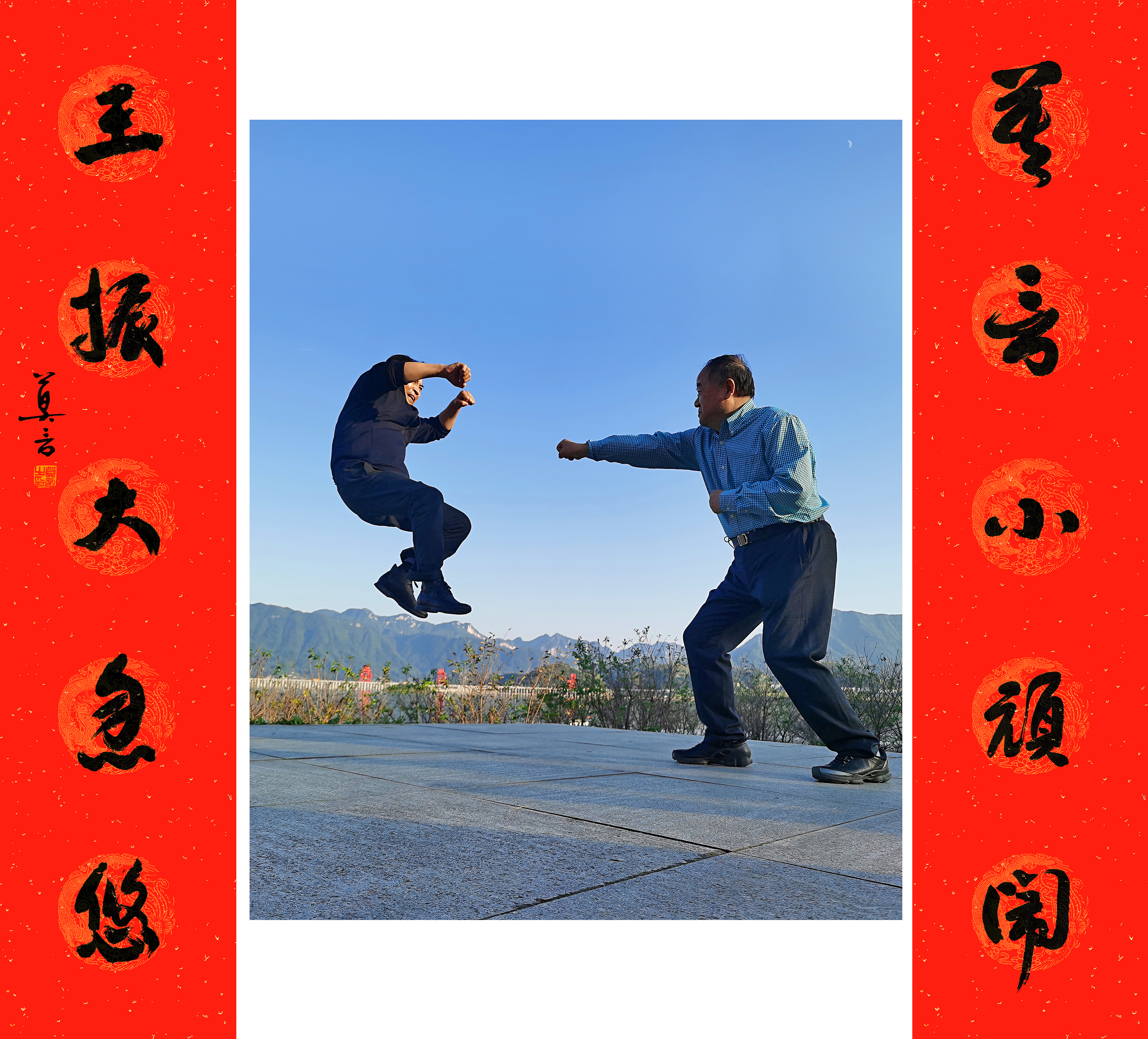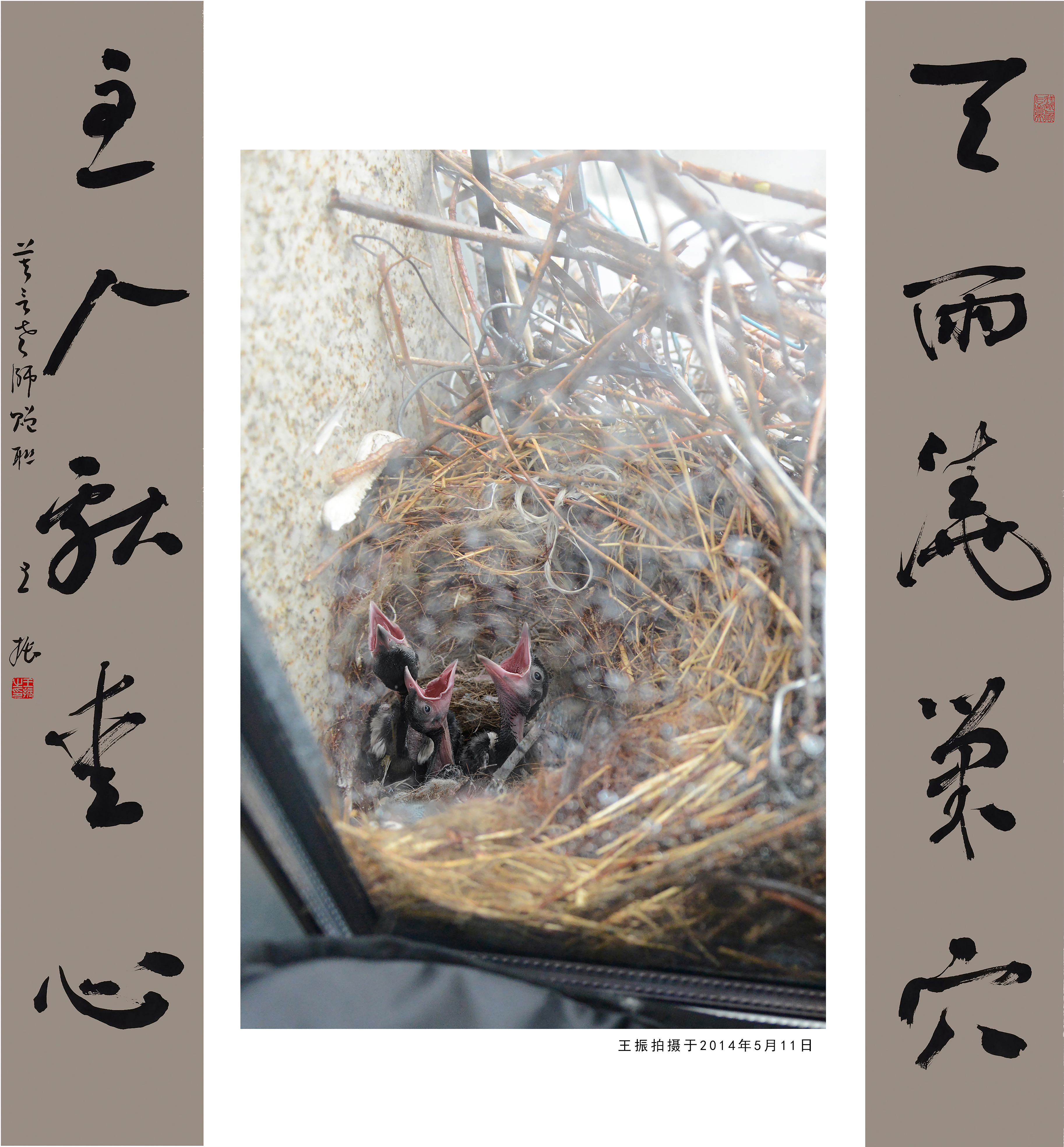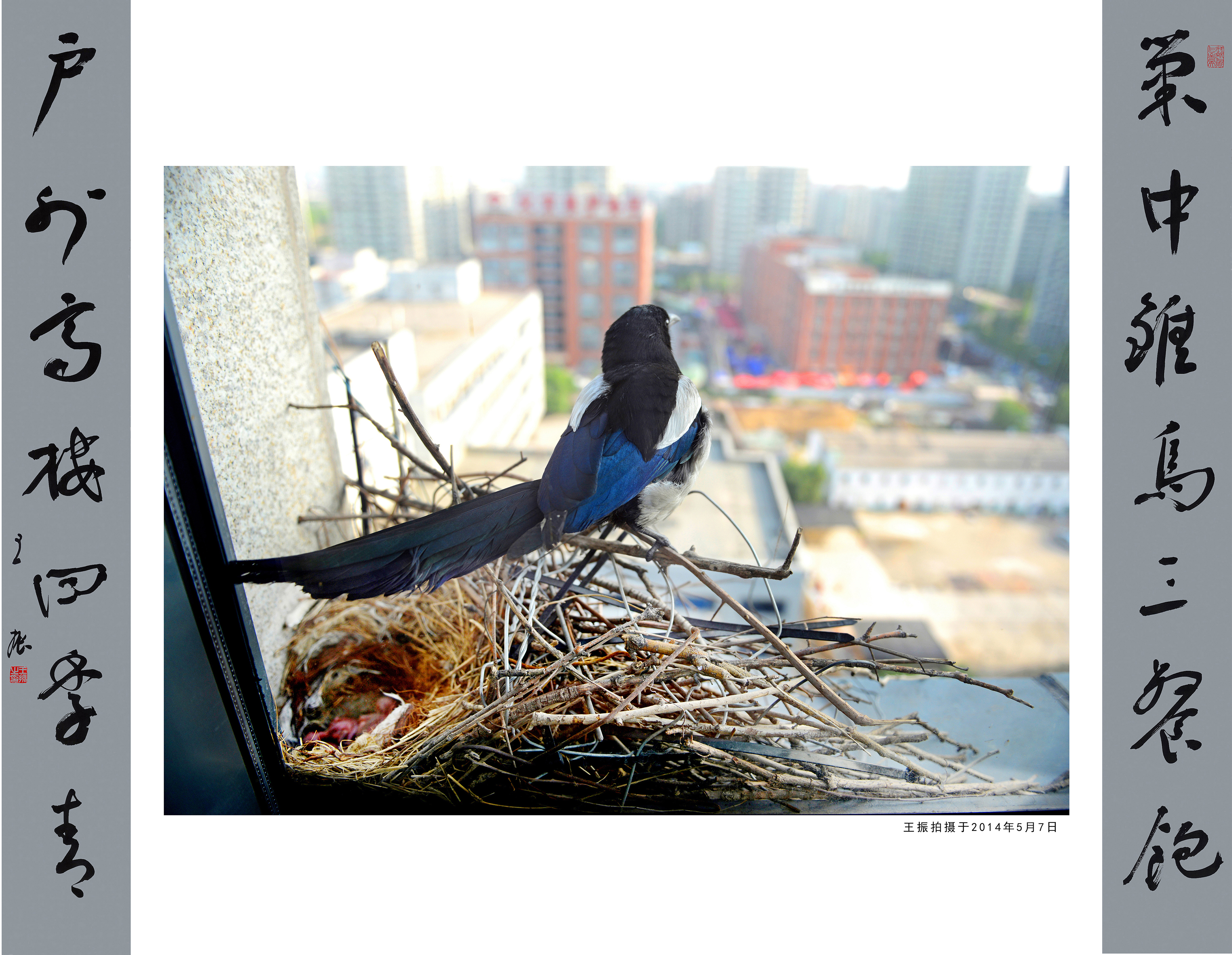 王振在開幕式上介紹說,「2014年3月底,兩隻喜鵲在我工作室窗台上歷經半年的辛苦,終於築成新窩,準備生兒育女。有朋自遠方來不亦樂乎,我把窗帘剪出幾個窟窿,把照相機、攝像頭伸到窗帘外,隔着玻璃拍下數萬個喜鵲一家生活的精彩瞬間。」自那之後,喜鵲一家築巢、產卵,恩愛孵卵、小喜鵲破殼,窗內,王振則臨帖、會友、創作,兩個世界上演了一幕幕和諧相伴的動人場景。