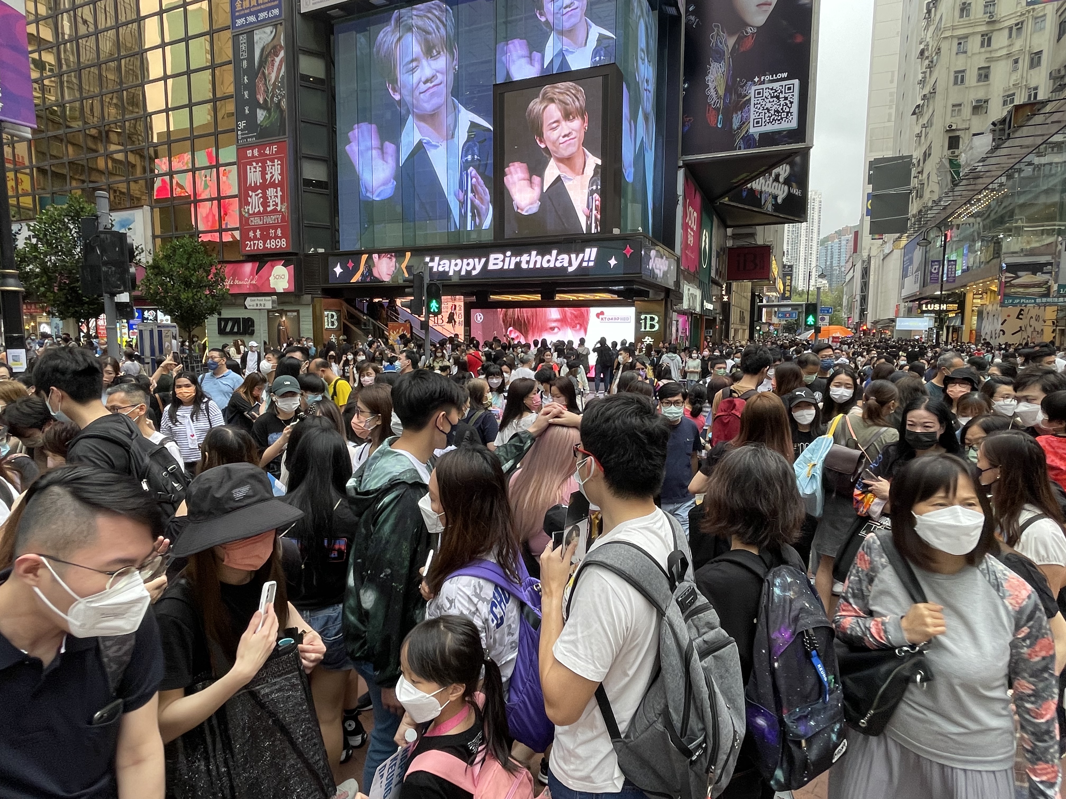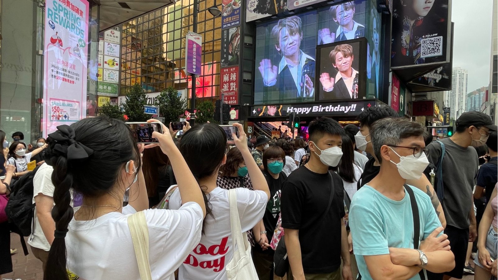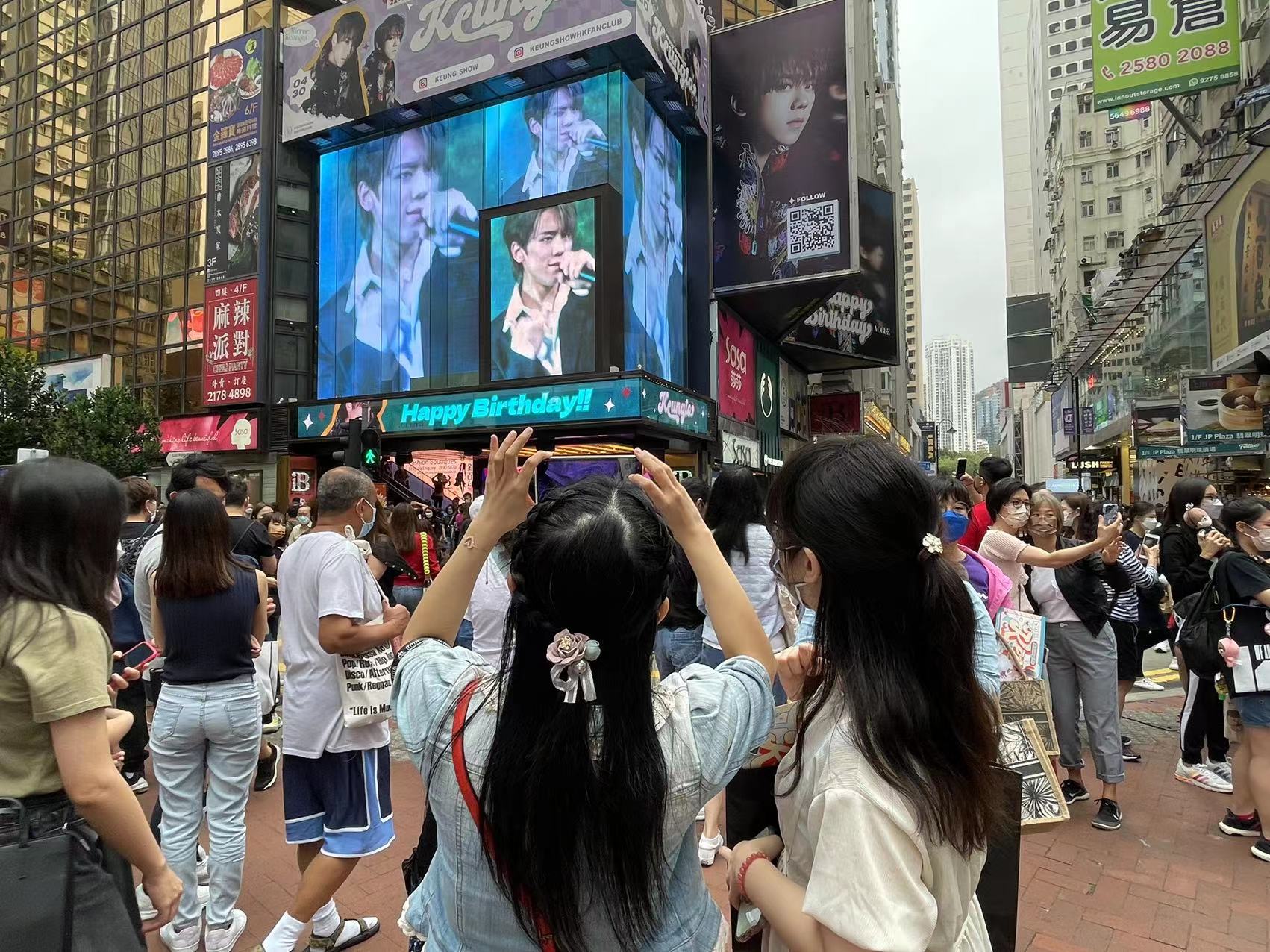 大公文匯全媒體記者今午在銅鑼灣東角道及百德新街一帶見到大批「姜糖」齊集,SOGO對開的大熒幕更不斷播放姜濤的影片,引起在場粉絲一陣陣歡呼聲。隨着越來越多粉絲聚集,更有警察出場維持秩序。此外,亦有大批粉絲在電車站排隊,期望登上車身印有姜濤的電車。