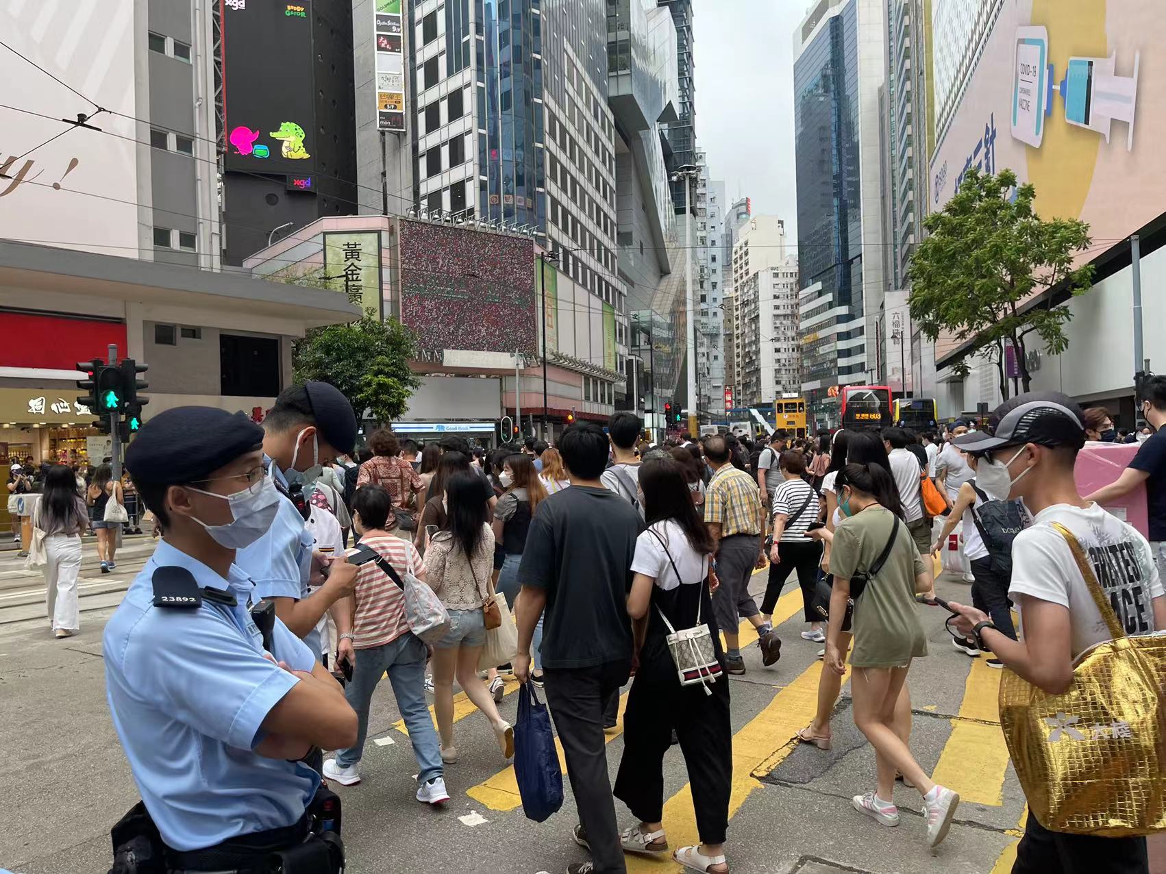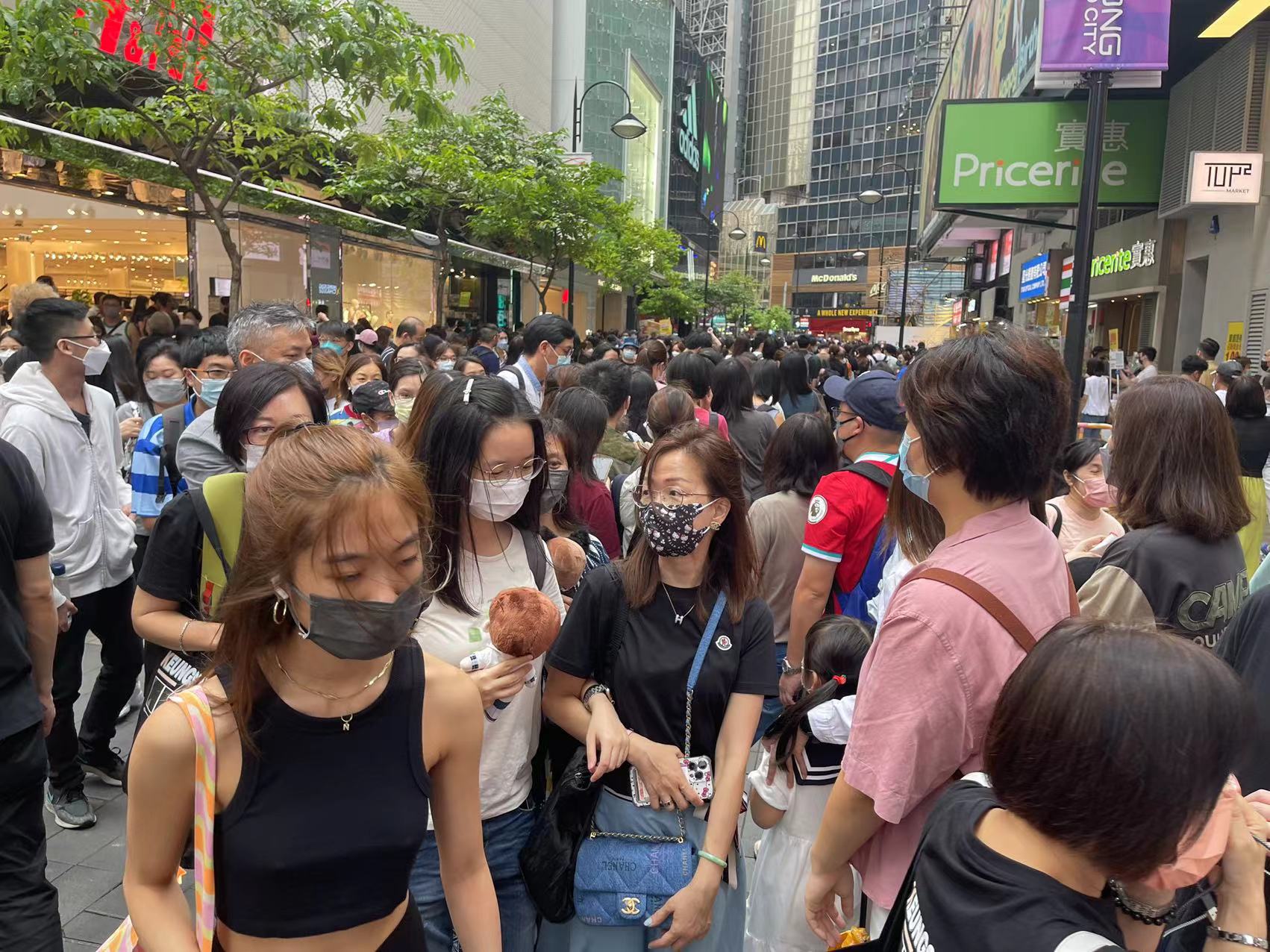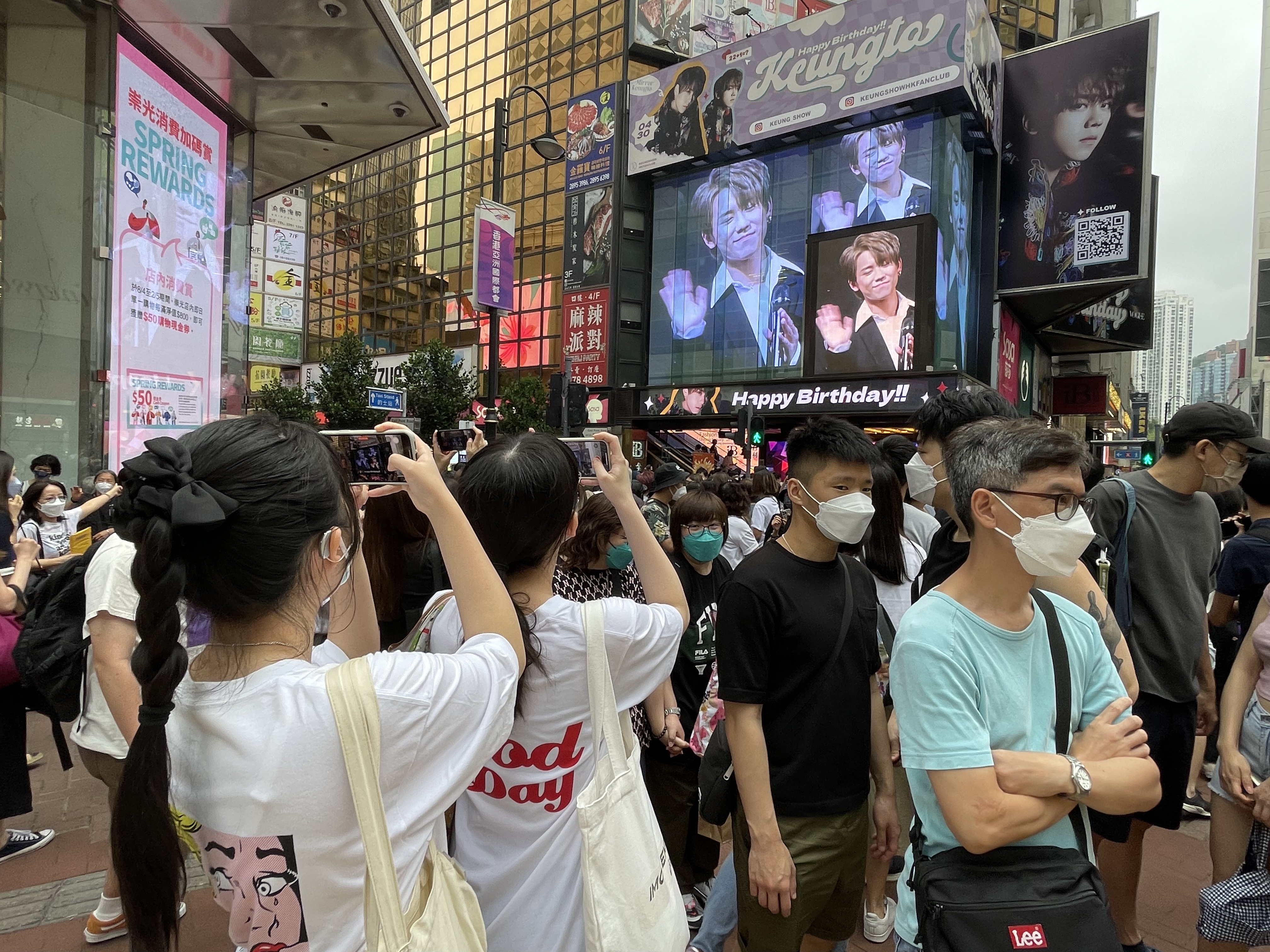 大公文匯全媒體記者今午在銅鑼灣東角道及百德新街一帶見到大批「姜糖」齊集,SOGO對開的大熒幕更不斷播放姜濤的影片,引起在場粉絲一陣陣歡呼聲。隨着越來越多粉絲聚集,更有警察出場維持秩序。此外,亦有大批粉絲在電車站排隊,期望登上車身印有姜濤的電車。
