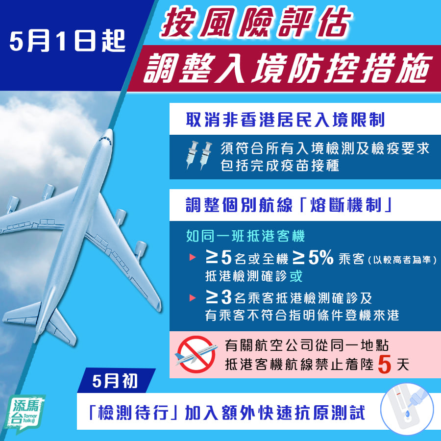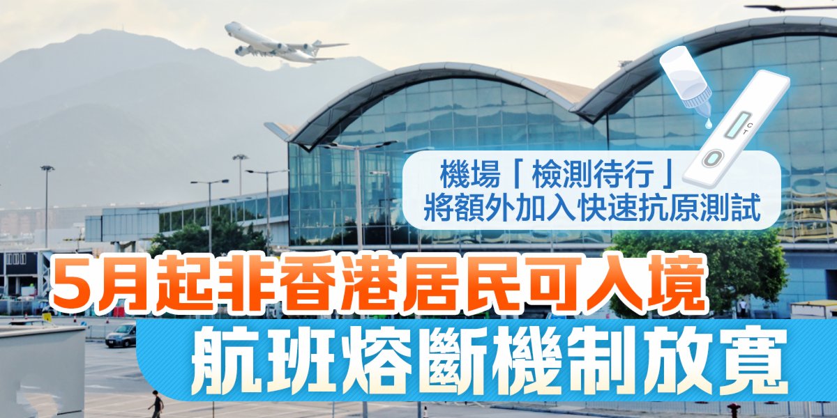 政府同時自今日起再度放寬航班熔斷機制,如果同一班抵港民航客機上有5名或以上的乘客,或全機乘客總數的5%或以上乘客(以較高者為準)經抵港檢測而確診;或有3名或以上的乘客經抵港檢測而確診及該航班容許1名或以上未能符合《預防及控制疾病(規管跨境交通工具及到港者)規例》(第599H章)下指明條件的乘客登機來港,相關航空公司從同一地點抵港的民航客機航線將被禁止着陸香港5天。