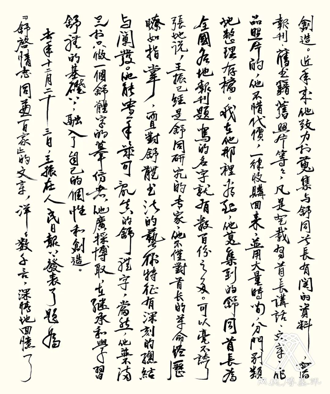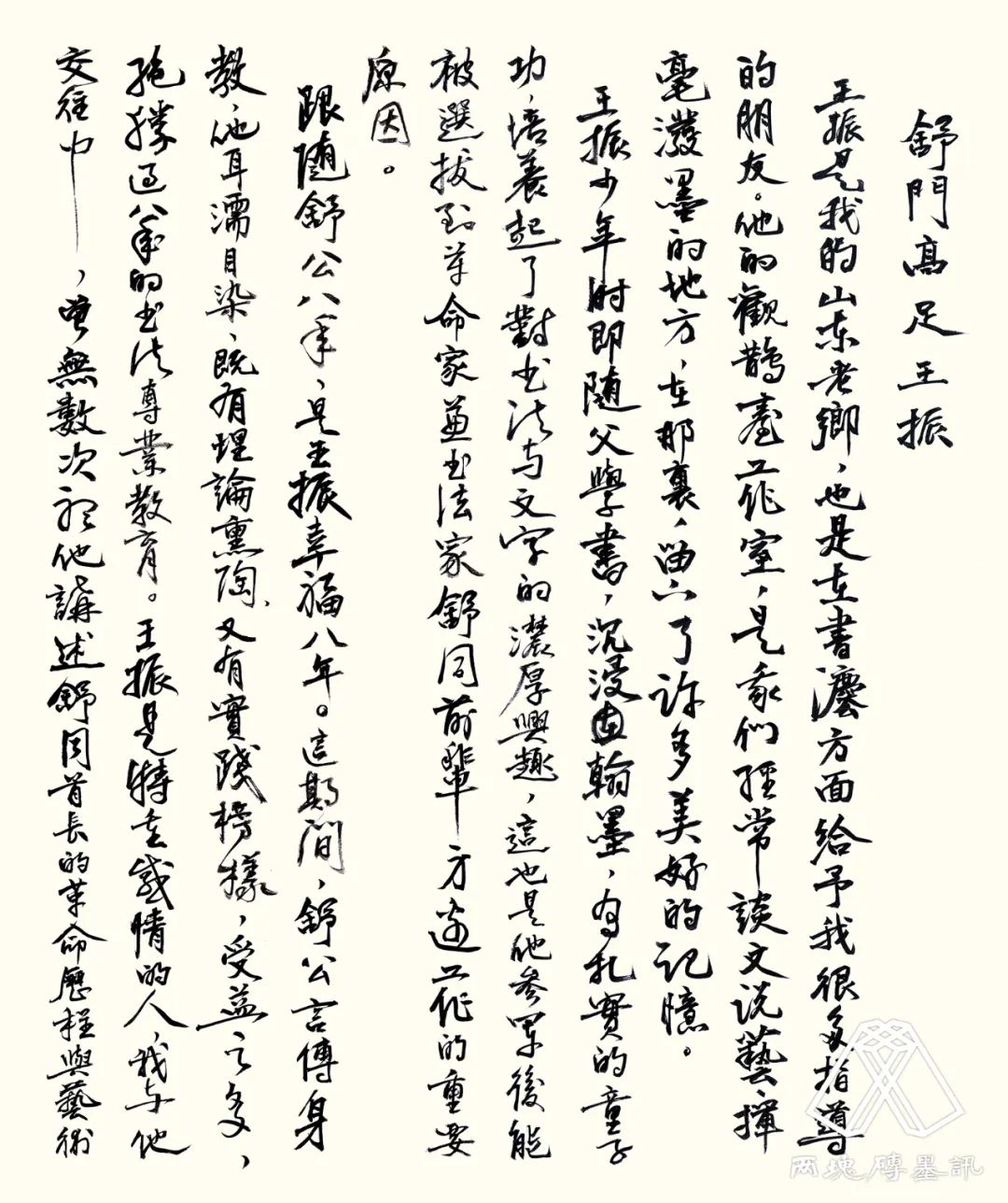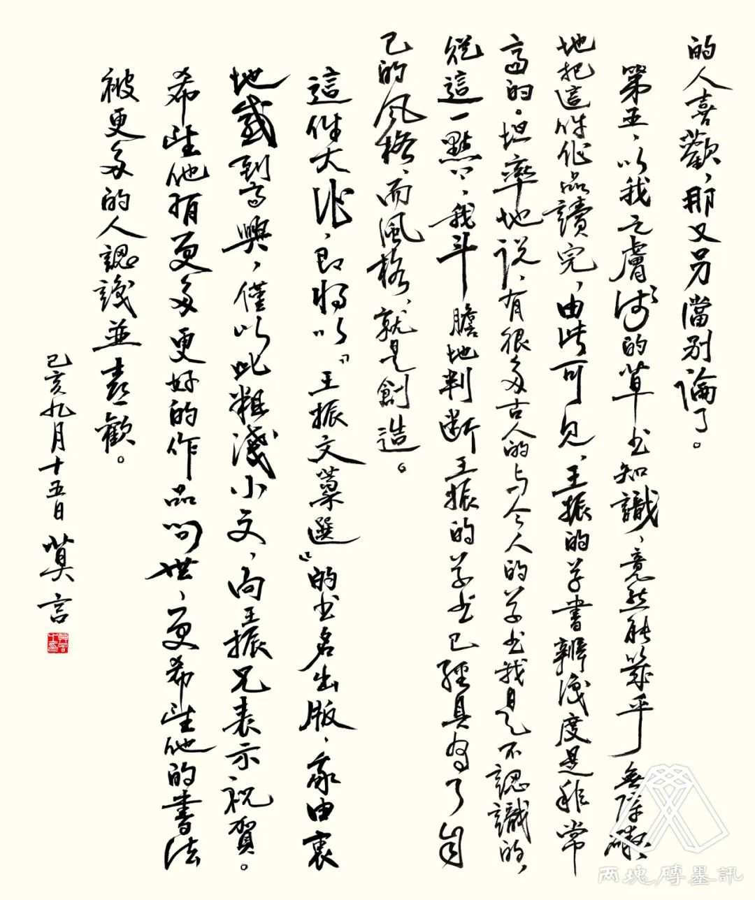 這件大作,即將以《王振文稿選》的書名出版,我由衷地感到高興,僅以此粗淺小文,向王振兄表示祝賀。希望他有更多更好的好作品問世,更希望他的書法被更多的人認識並喜歡。