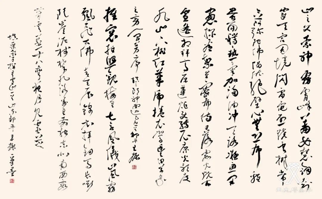 去年十二月二十三日,王振在人民日報上發表了題為《舒啟情志,同兼百家》的文章,洋洋數千言,深情地回憶了他服務舒公的經歷和學書問藝的體會。文章寫得生動活潑,繪聲繪色,我讀後甚為喜歡,並建議他用擅長的草書寫一遍。他在海南,利用照顧患病老父的空閑,完成了這件精美的、具有很高藝術價值的作品。