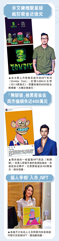 (大公報記者 葉浩源)NFT(非同質化代幣)炒風熾熱,風頭與虛擬貨幣並駕齊驅,網絡上瀰漫投資暴富的消息。然而,潛在回報高伴隨的風險也高,早前藝人余文樂創作的NFT項目大賺近億元,另一邊廂巨星周杰倫卻被盜去NFT商品,損失近400萬元。