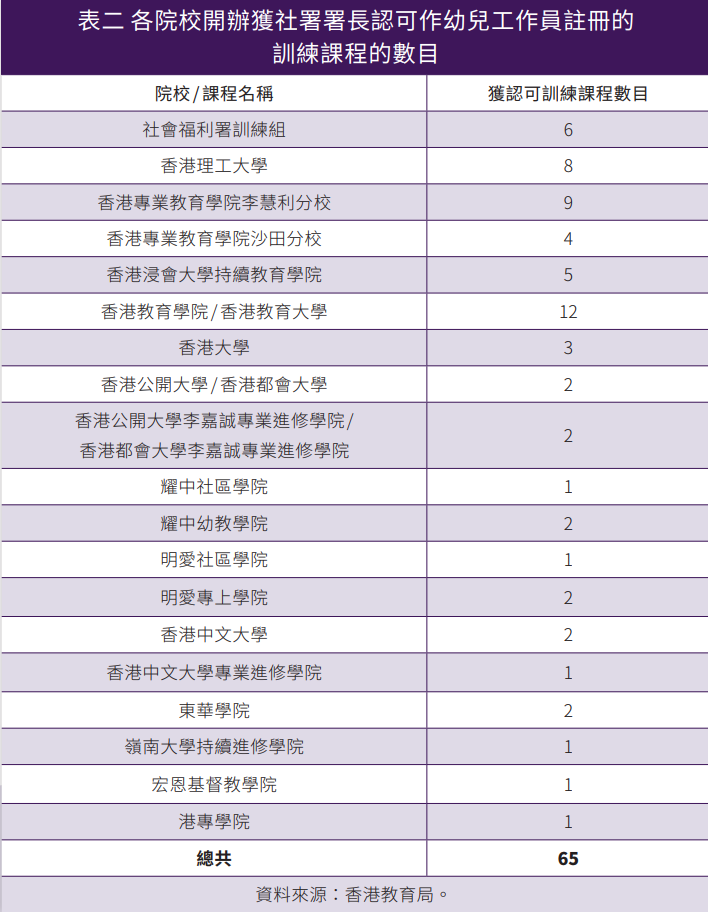 研究團隊也翻查受社署署長認可的課程名單,發現課程年期由約一年至五年不等,課程內容不一,收生要求亦不盡相同,導致其知識水平和能力也會有較大差別,繼而影響服務質量。但一直以來,無論是作為評定訓練課程是否受認可的社署,還是負責審批幼兒工作員申請資格的教育局,均沒有就資格門檻提出質疑或提出社會發展提升門檻的建議,繼續沿用多年的課程名單作為審批標準,反映即使是跨部門協作,各部門都傾向專注處理自己的工作範疇事務。