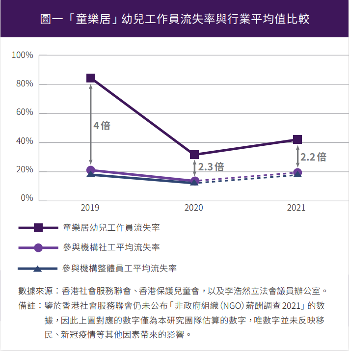 研究報告指出,在2019年及2020年「童樂居」幼兒工作員流失率,分別為84.4%及31.7%,為香港非政府組織的整體員工平均流失率的4倍及2.3倍,但卻沒得到社署的協助與介入。研究團隊指出,人員流失率大的原因是其內部存在粗魯處理兒童問題的工作文化,人手緊張、工作壓力大,職業發展不清晰,導致幼兒工作員七成任職不足3年。