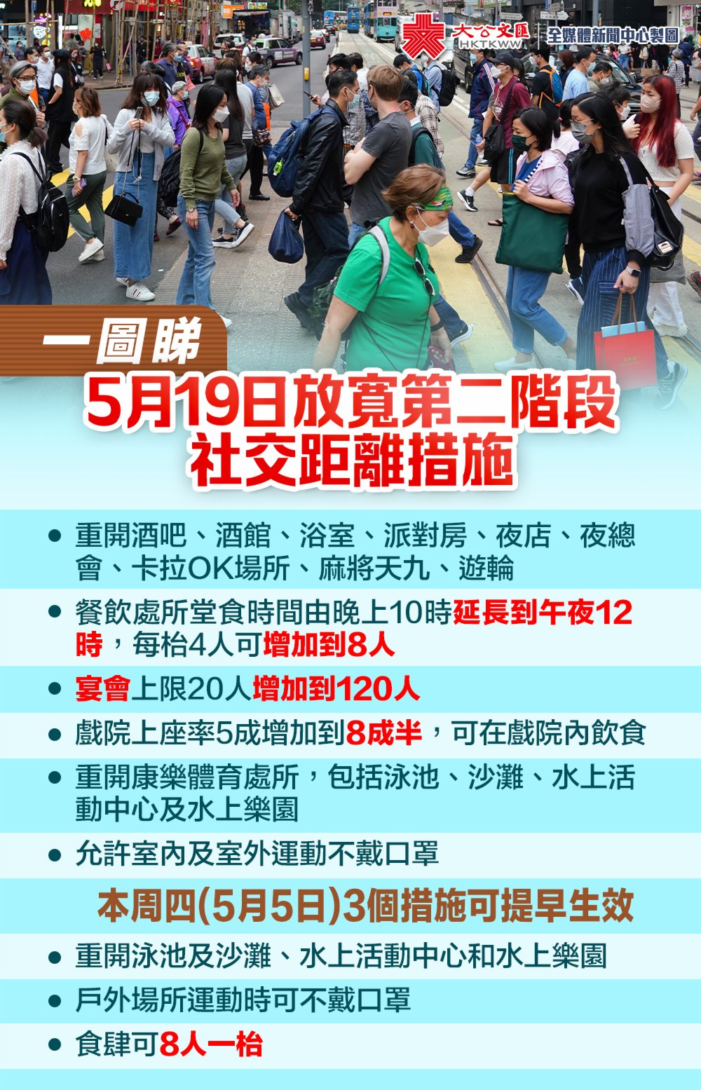 本港4月21日起放寬第一階段社交距離措施,林鄭表示,疫情未發生反彈,穩控程度較預期快,每日單日確診數字持續下降,污水監測中的陽性樣本亦下降,有信心繼續在復常之路開步前行。本月19日繼續放寬第二階段社交距離措施,包括延長堂食時間至午夜12時、食肆可8人同桌、重開酒吧、解除室內及室外運動須戴口罩要求等。惟仍有每桌人數及處所容量的限制,酒吧及酒館可營業至凌晨2時,但需4人一枱。
