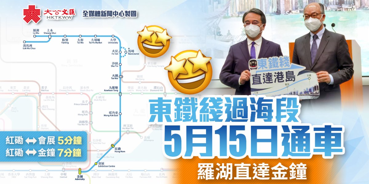 大公文匯全媒體報道,運輸及房屋局局長陳帆今日(3日)見記者時公布,東鐵綫過海段定於5月15日開通,成為香港第4條過海鐵路。而位於灣仔北的會展站、以及紅磡站和金鐘站的擴建部分,亦會同時投入服務。通車後,市民無須轉車即可往來新界東北及港島,而由紅磡前往會展,車程只需要約5分鐘時間,紅磡往金鐘更由19分鐘大減至7分鐘。