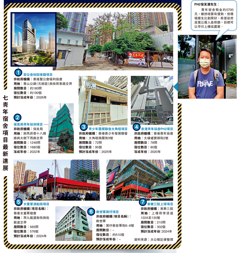 政府早於2011年提出推行「青年宿舍計劃」,幫助在職青年解決住宿問題,惟11年後的今天,七個項目只一個入伙,青年人等到中年都未能入住。大公報記者到六個未落成項目現場了解,發現只有較偏遠的元朗保良局青年宿舍初步落成,位於佐敦、灣仔、上環、大角咀及元朗港鐵站旁的宿舍項目一概「冇影」。