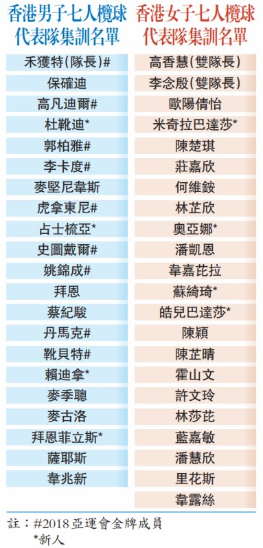 昨日公布的兩支港隊大軍名單均為香港欖球界精英,包括男子隊隊長禾獲特、 女子隊雙隊長李念殷和高香慧。9位曾代表香港贏得男子亞運金牌的球員也會一同前往集訓,而去年11月由女隊主帥莫以恆欽點參加杜拜舉行的「亞洲七人欖球系列賽」的三位新人──林莎芘、韋嘉芘拉和韋露絲也歸隊再戰國際賽。